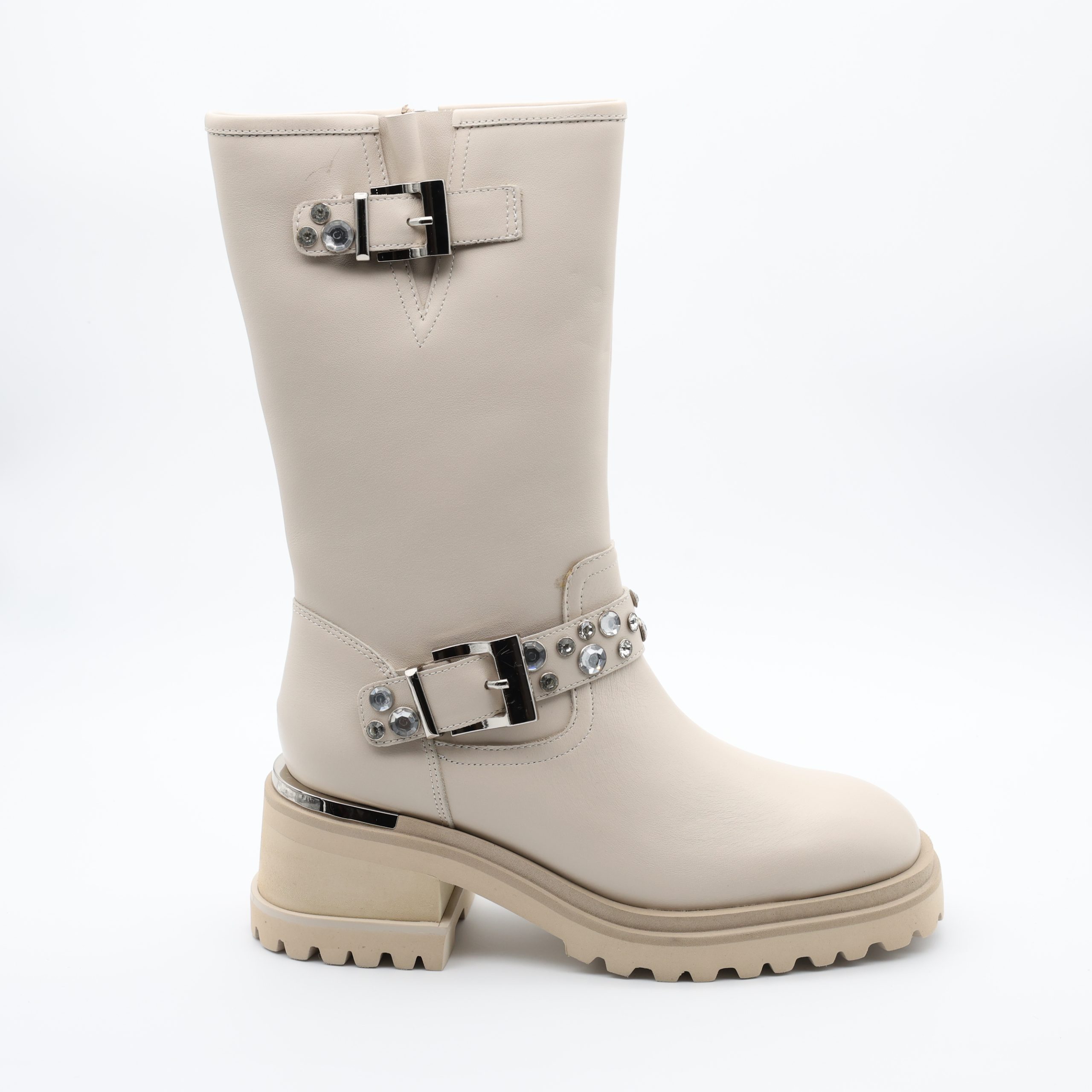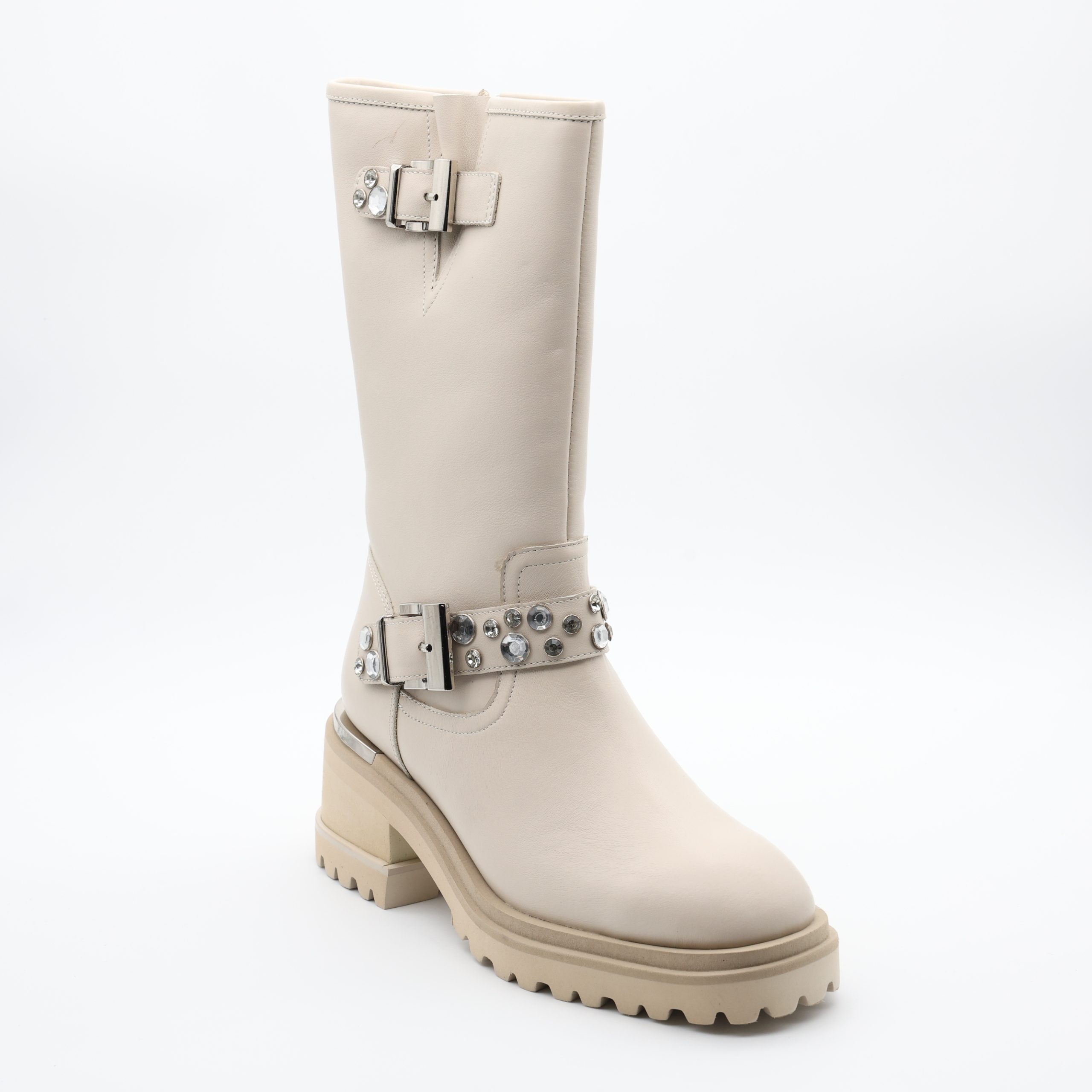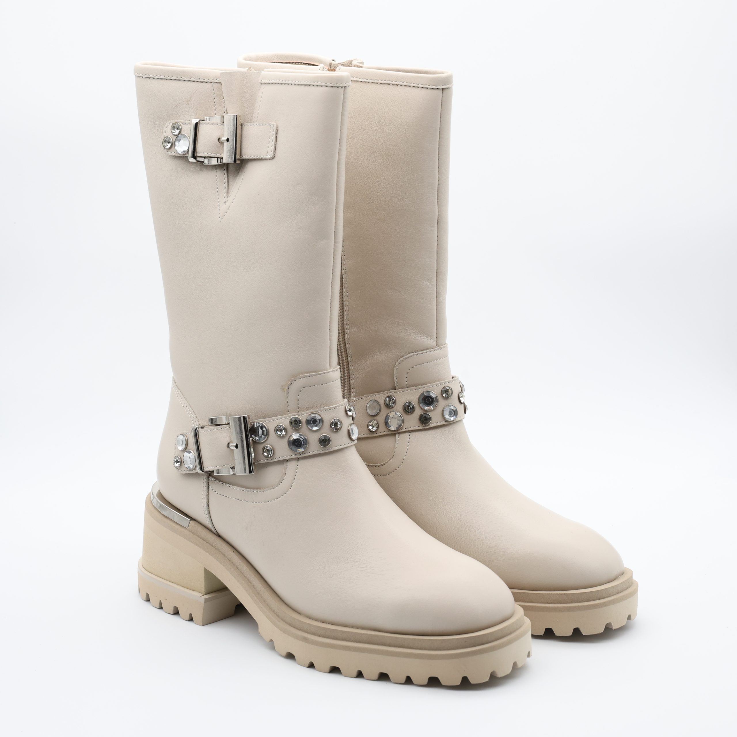 As Botas Alma en Pena I240901 reinterpretam o estilo biker com um toque de sofisticação e brilho. Feitas em pele suave na elegante cor bege, apresentam duas fivelas metálicas adornadas com cristais, que conferem um toque de luz e modernidade ao modelo.