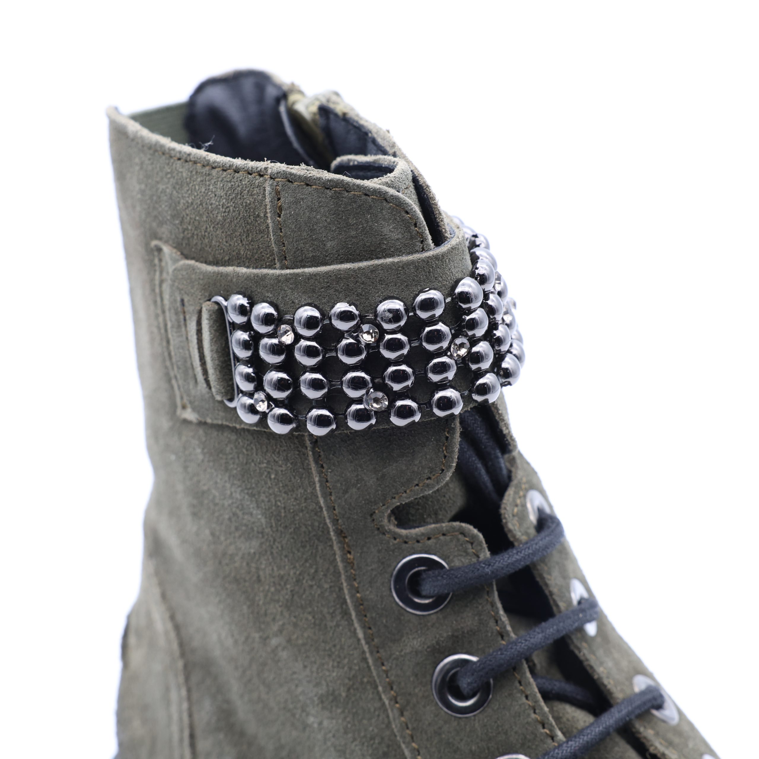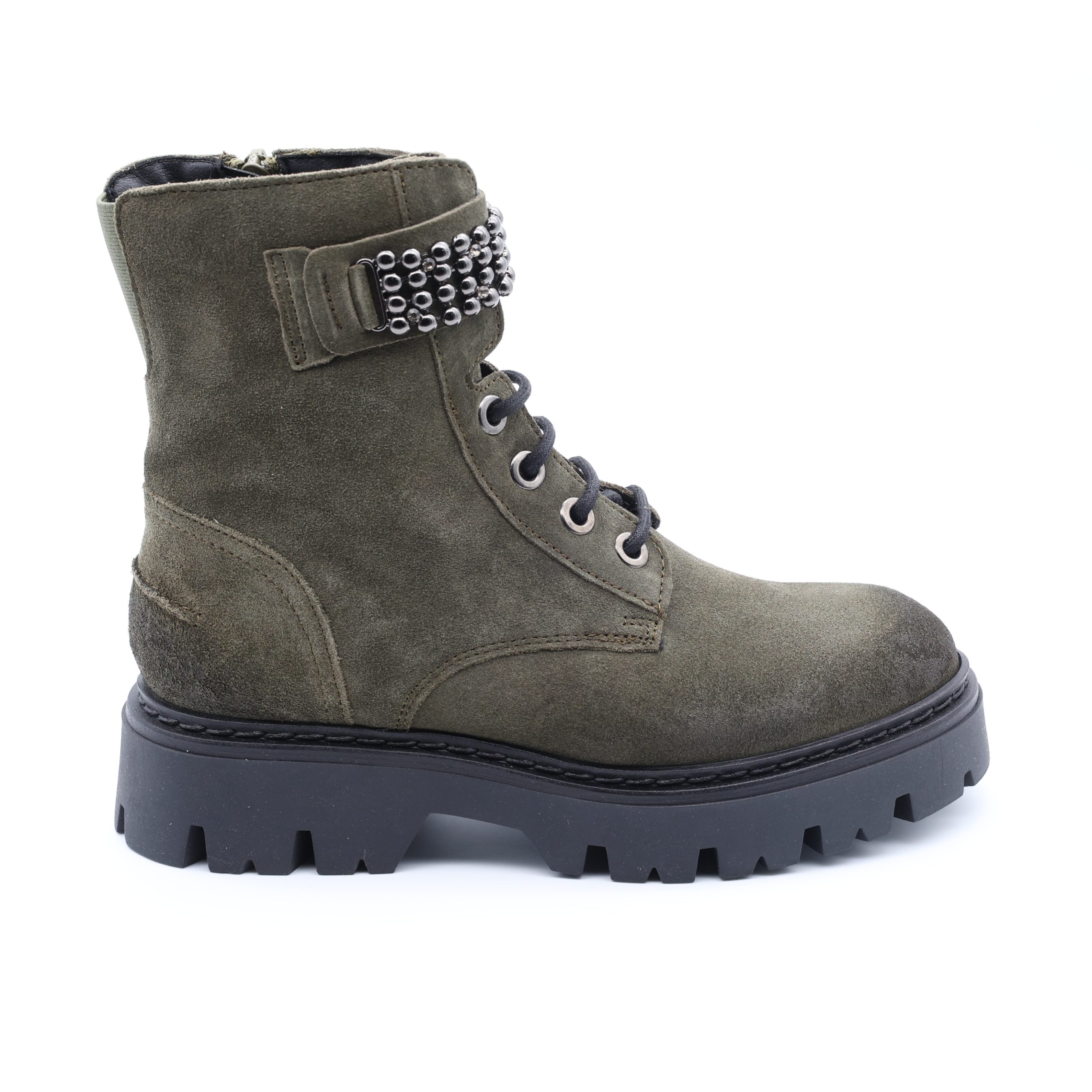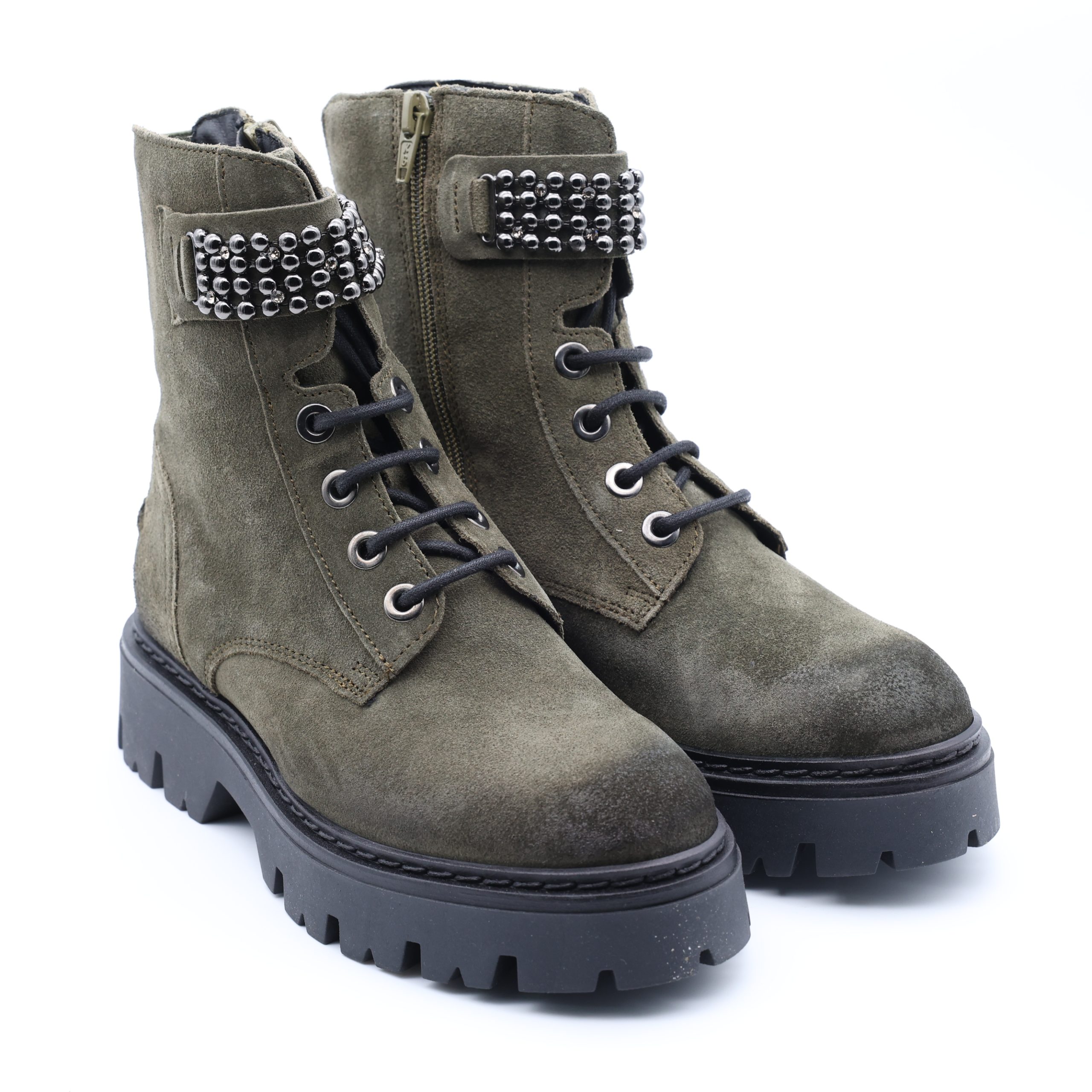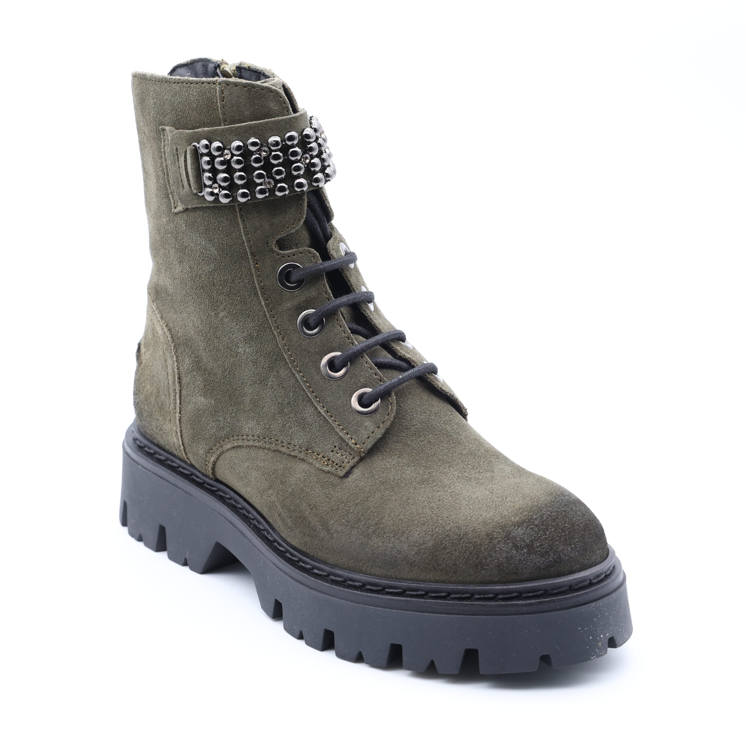 As Botas Cafè Noir FC6004 destacam-se pela sua combinação perfeita de estilo militar e elegância contemporânea. Fabricadas em camurça macia, apresentam atacadores frontais e tira com tachas metálicas, que acrescentam um toque moderno e sofisticado.