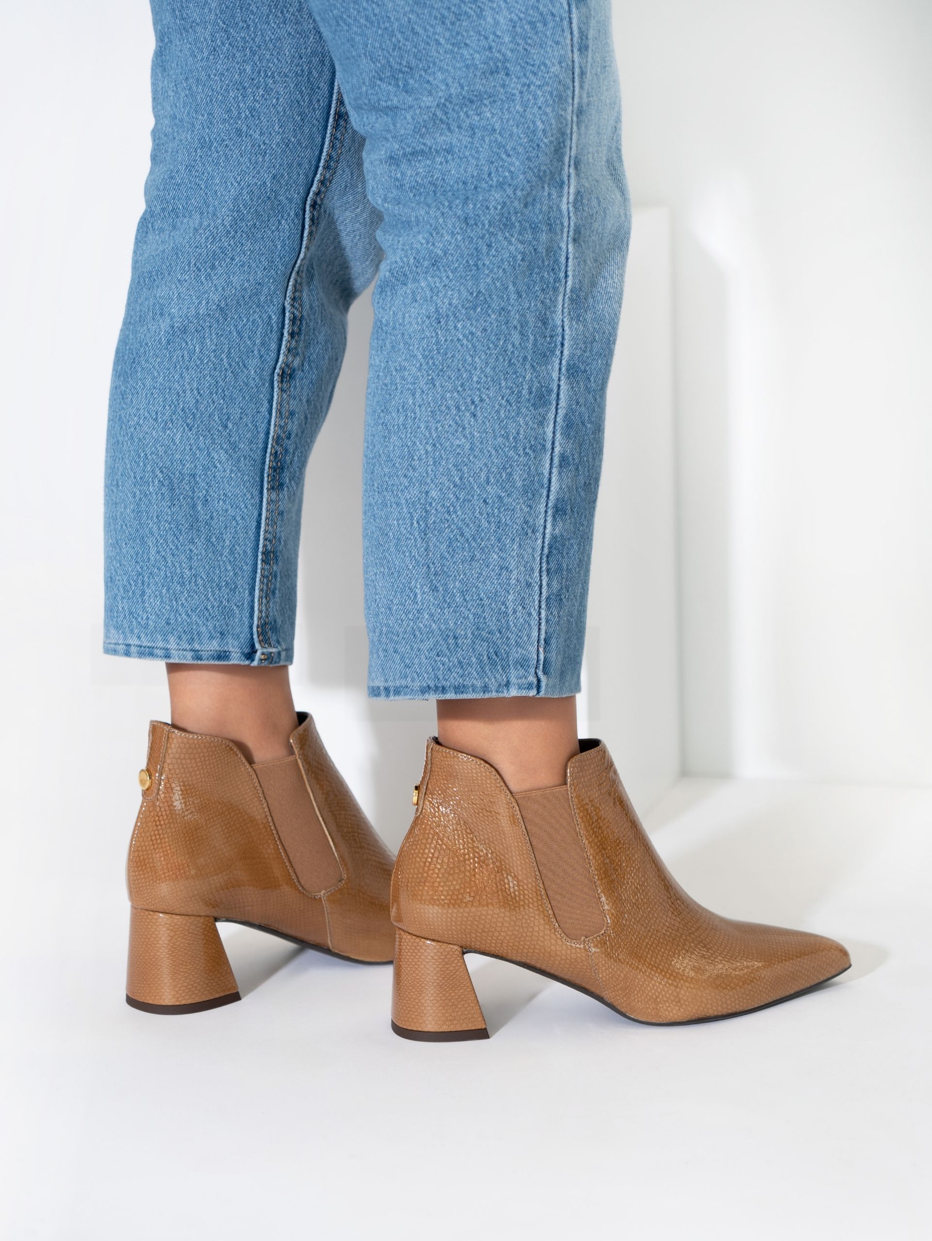 👢 Exterior: verniz / pele com acabamento elegante
