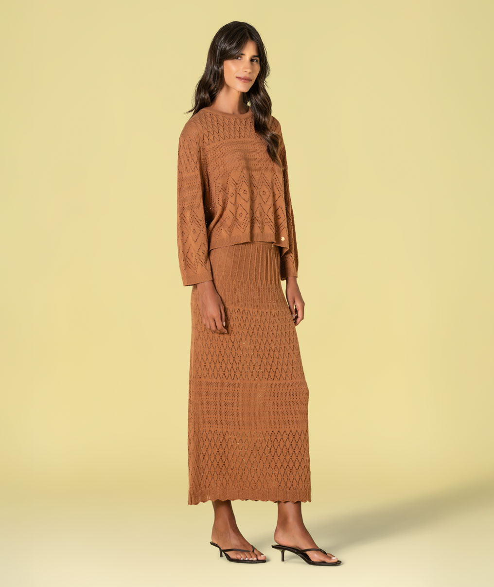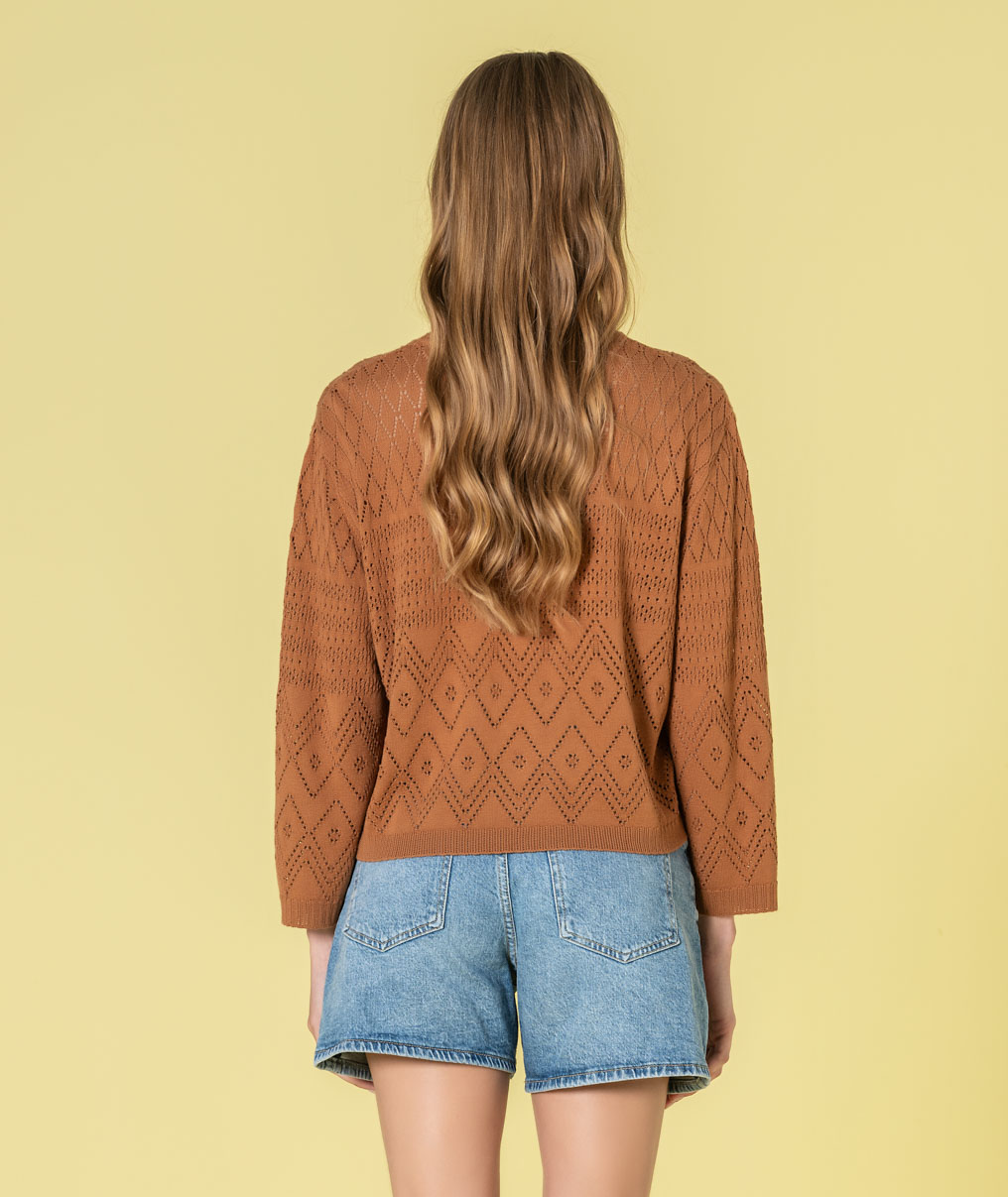 🧵 Design: malha perfurada com padrão geométrico que confere textura e um visual delicado à peça