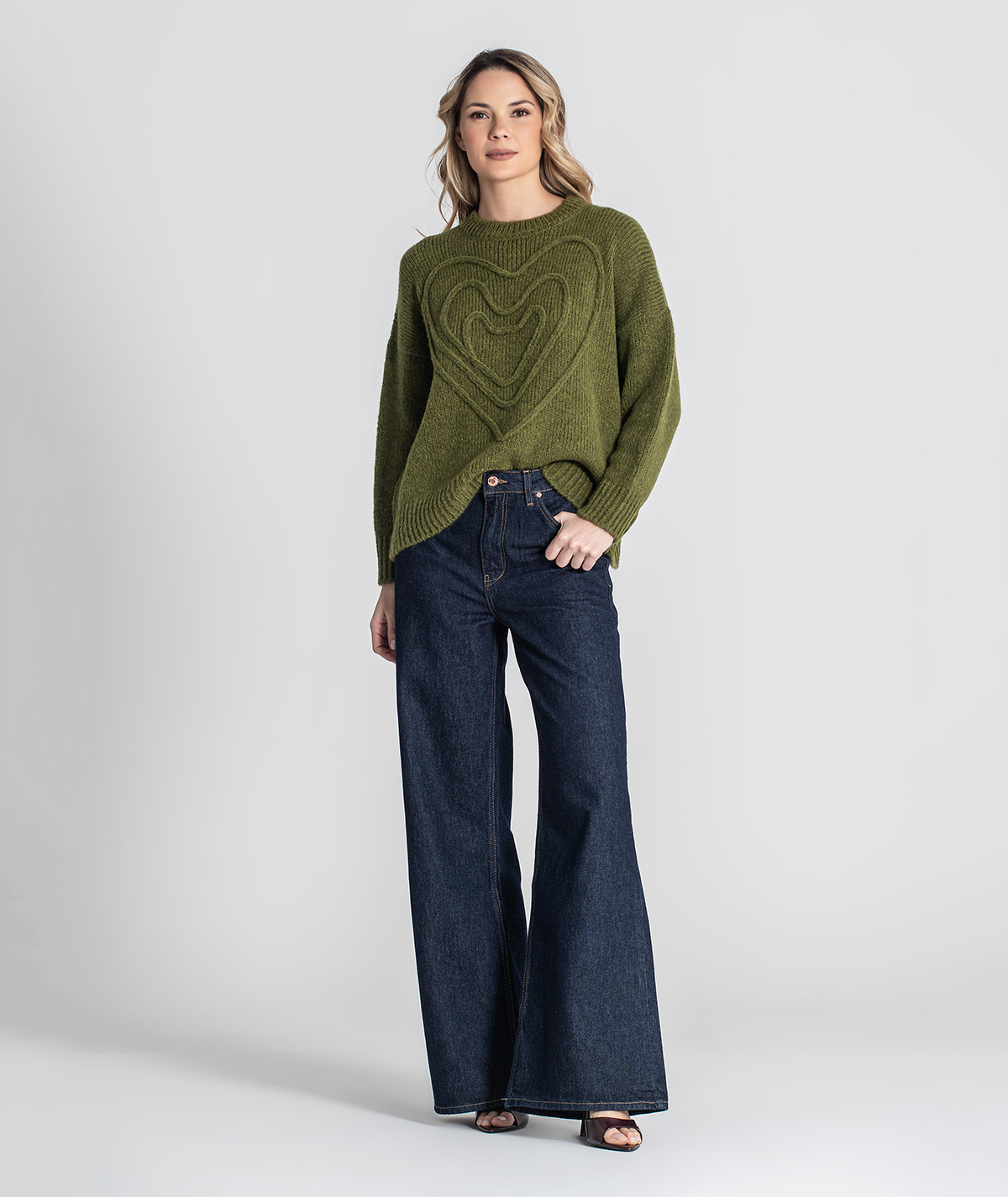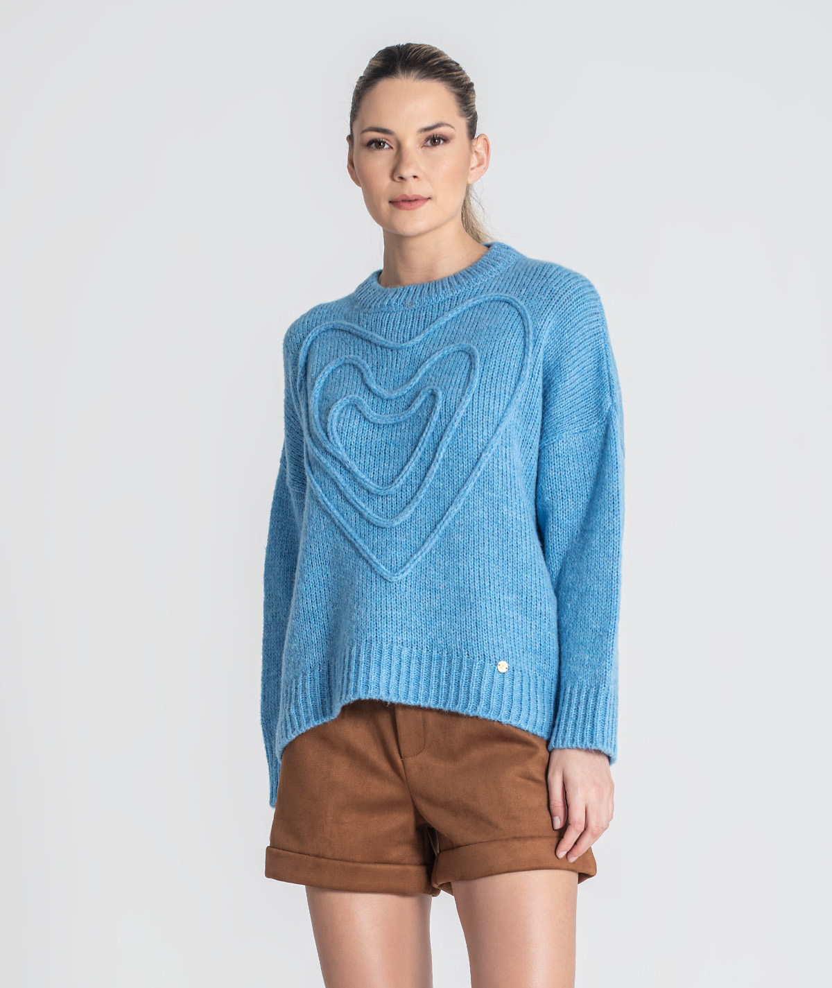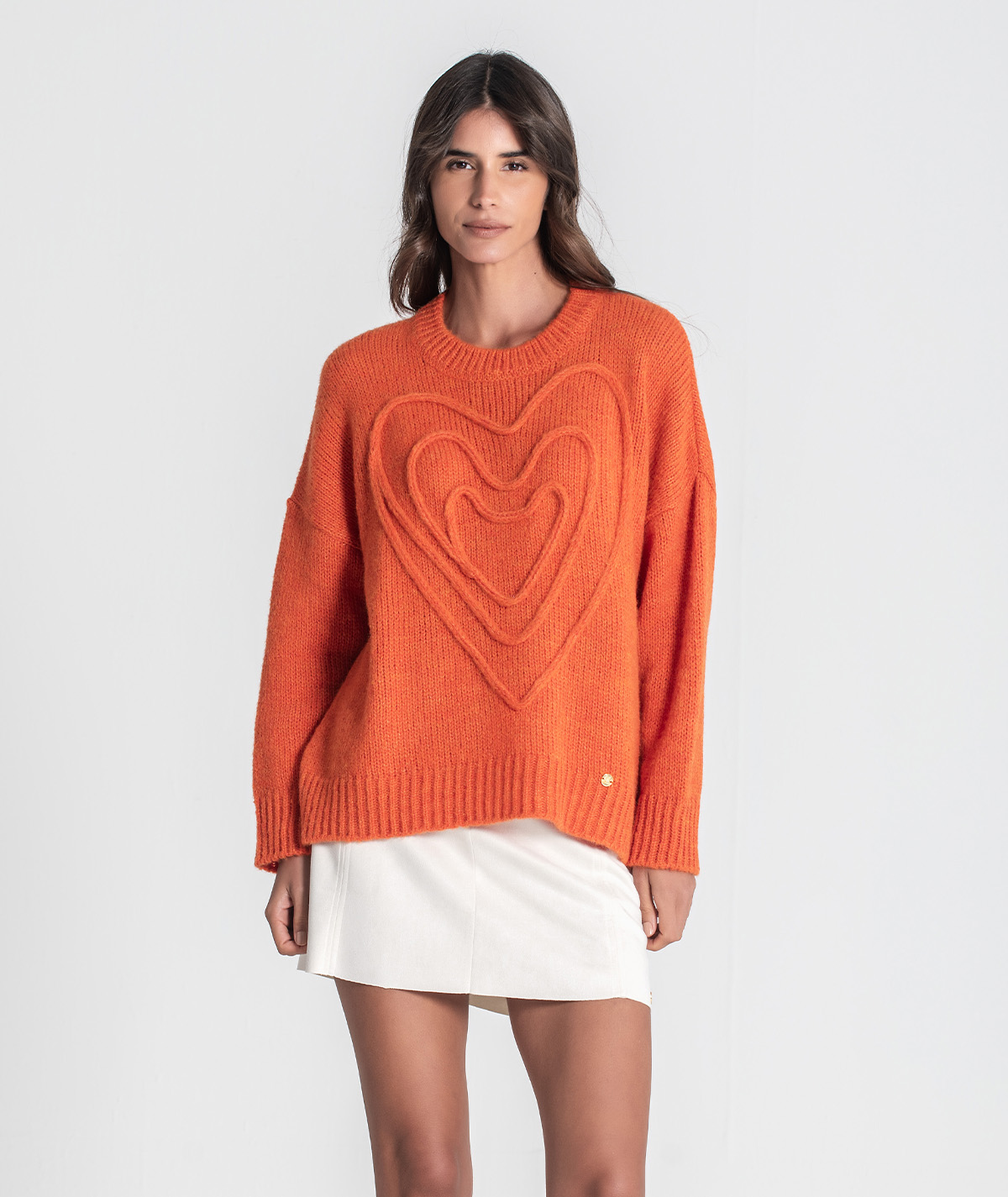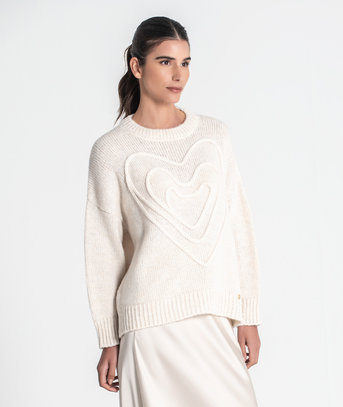 Delicada e cheia de charme, esta camisola destaca-se pelo bordado em forma de coração na frente, que acrescenta um toque romântico e feminino. O design simples com decote redondo torna-a uma peça versátil, ideal para looks casuais e confortáveis com um detalhe especial.