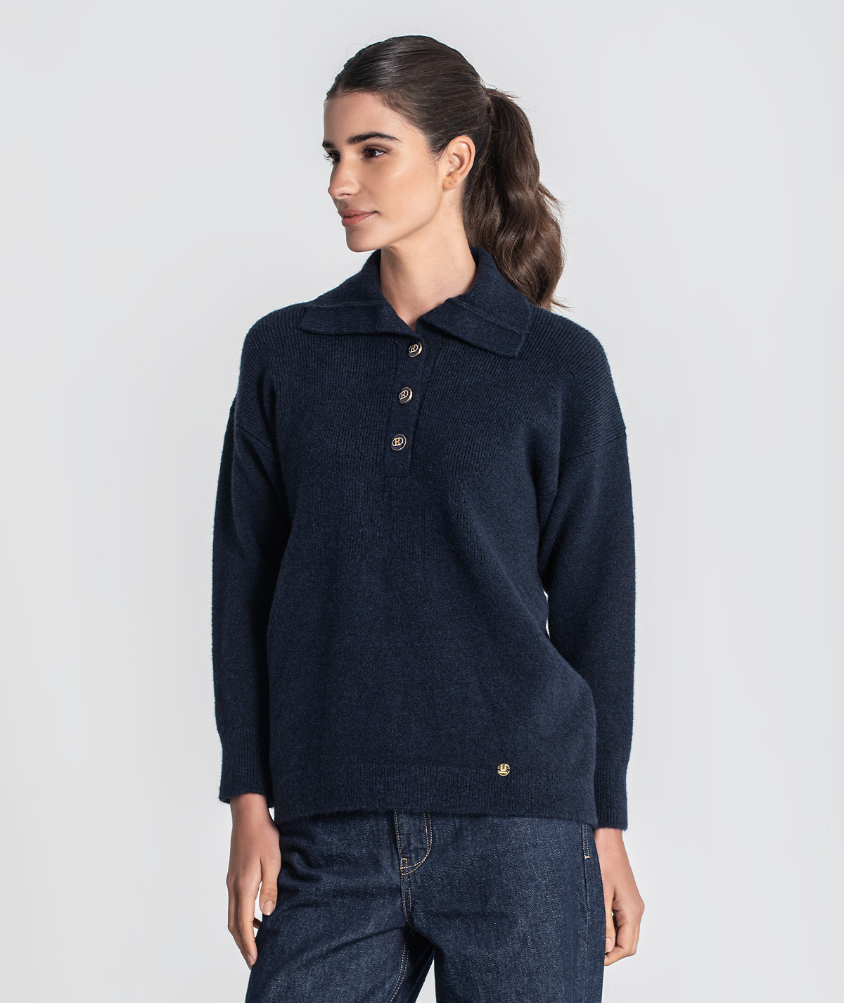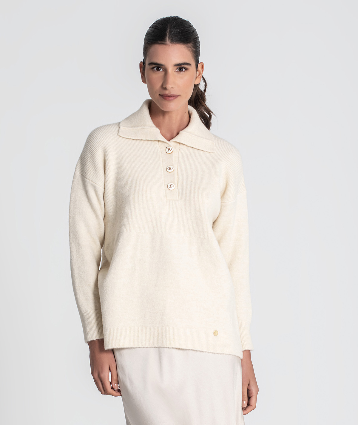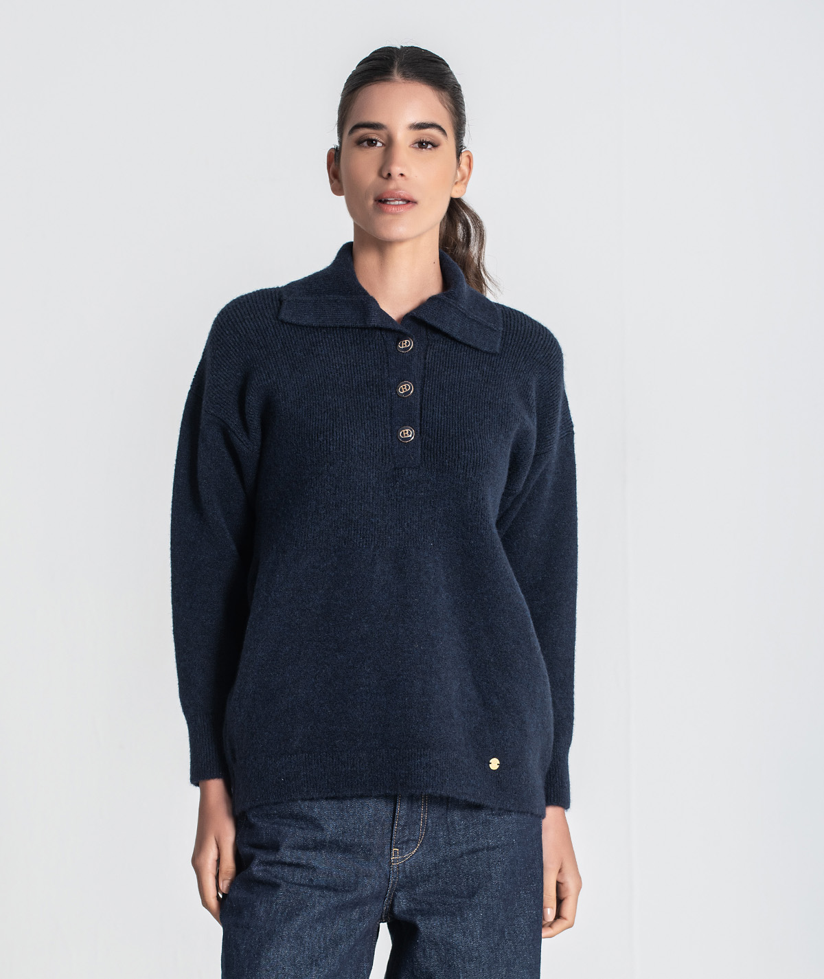 Clássica e versátil, esta camisola distingue-se pelos botões personalizados que acrescentam um toque de elegância e originalidade. Uma peça confortável e prática, ideal para conjugar com diferentes estilos — desde o casual ao mais sofisticado.