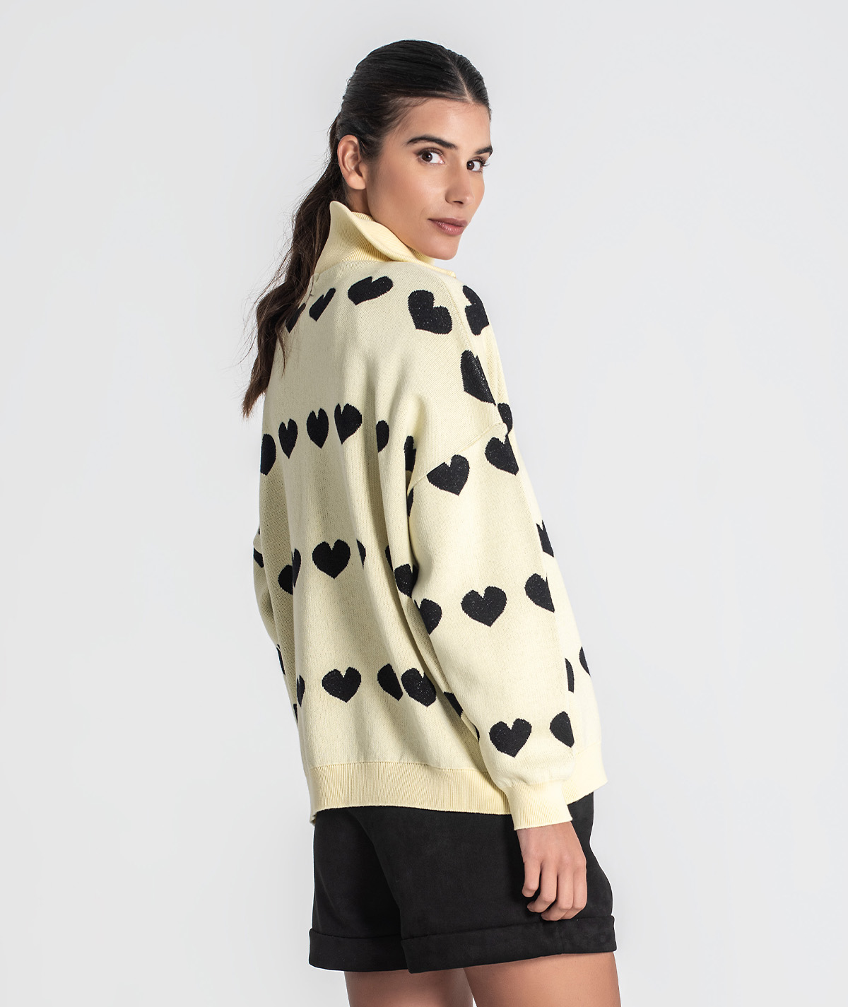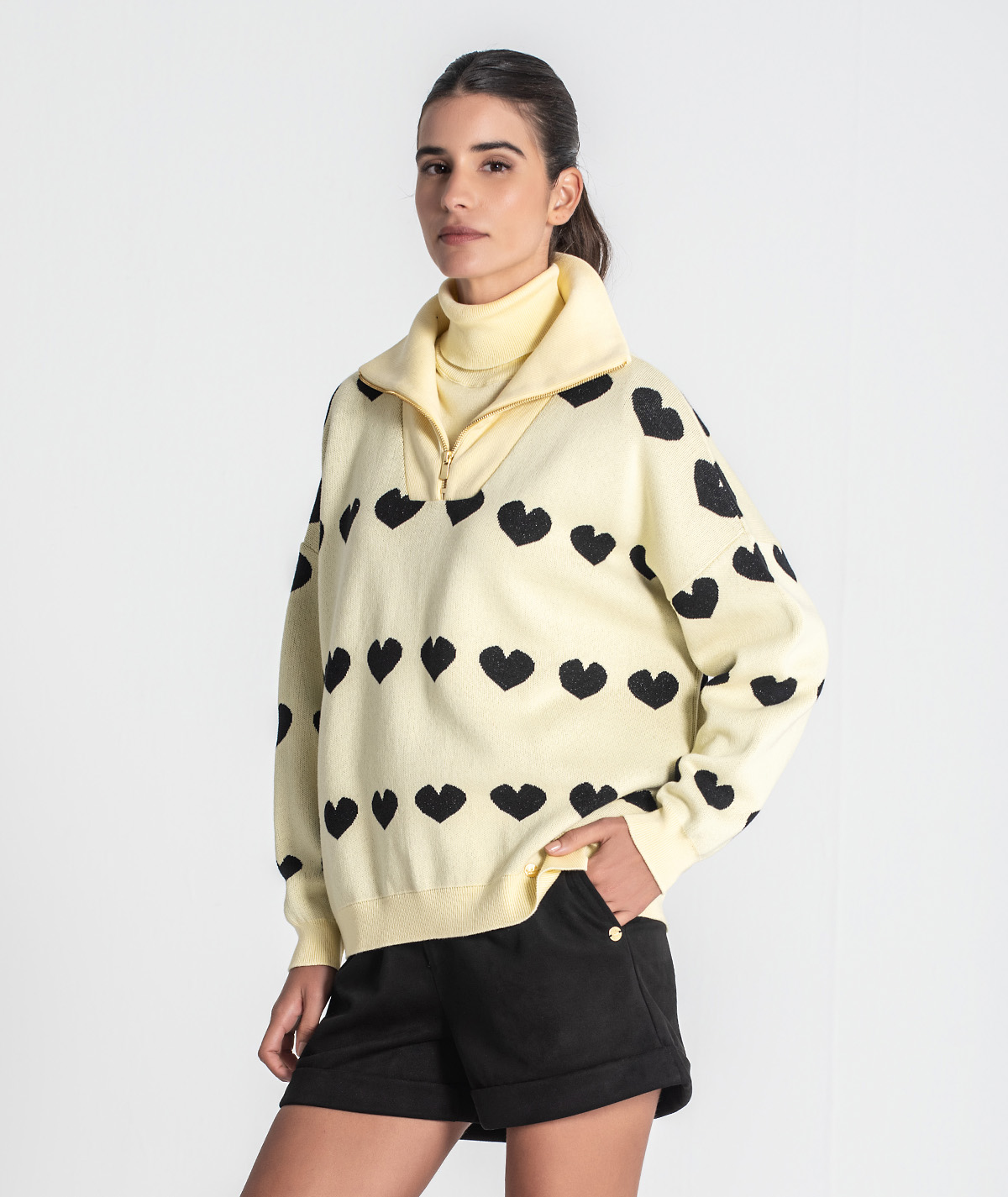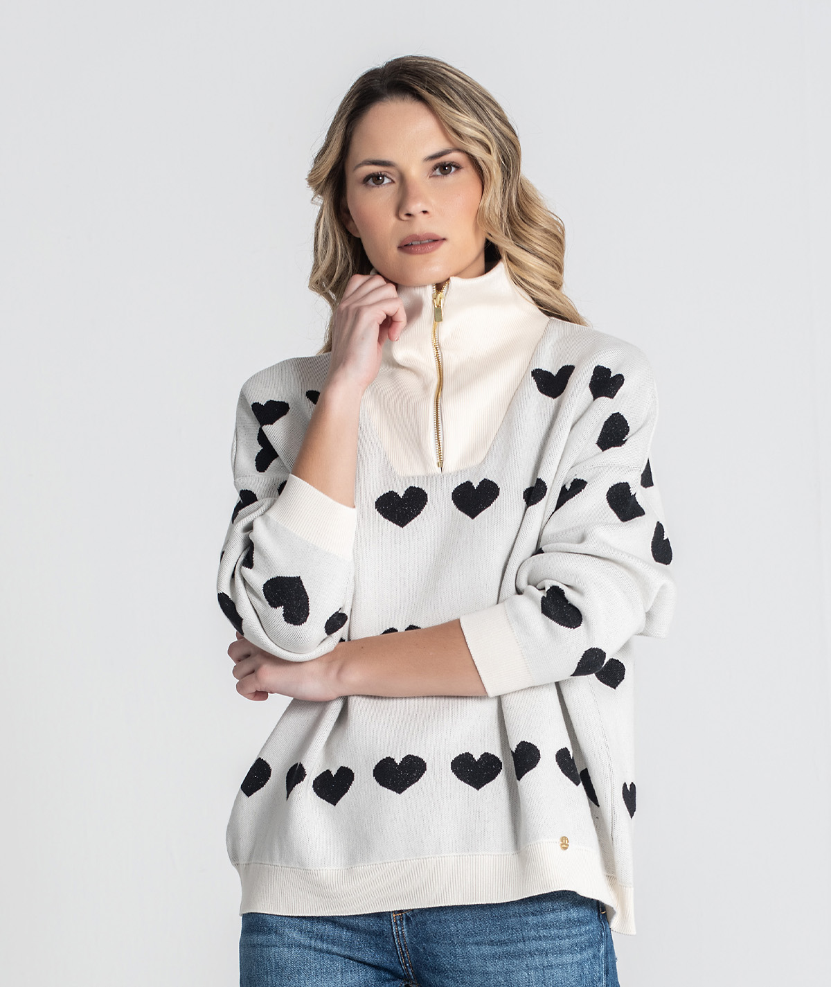 A Camisola Ruga 3464 destaca-se pelo seu design feminino e elegante, com um delicado padrão de corações em jacquard com brilho que confere um toque especial à peça. O efeito luminoso subtil torna-a perfeita para quem gosta de detalhes diferenciadores sem exageros. Com fecho frontal, alia praticidade a um visual moderno, permitindo usar a camisola aberta ou fechada, conforme o estilo pretendido.