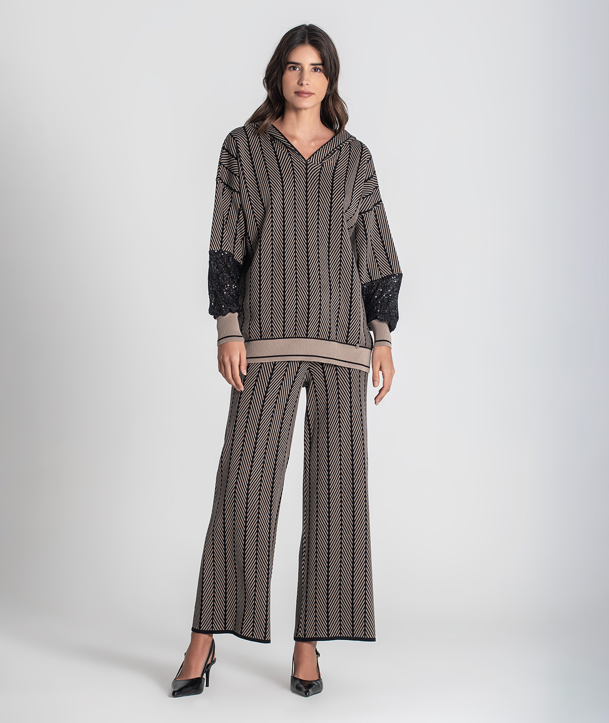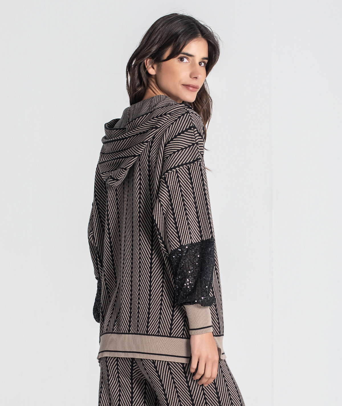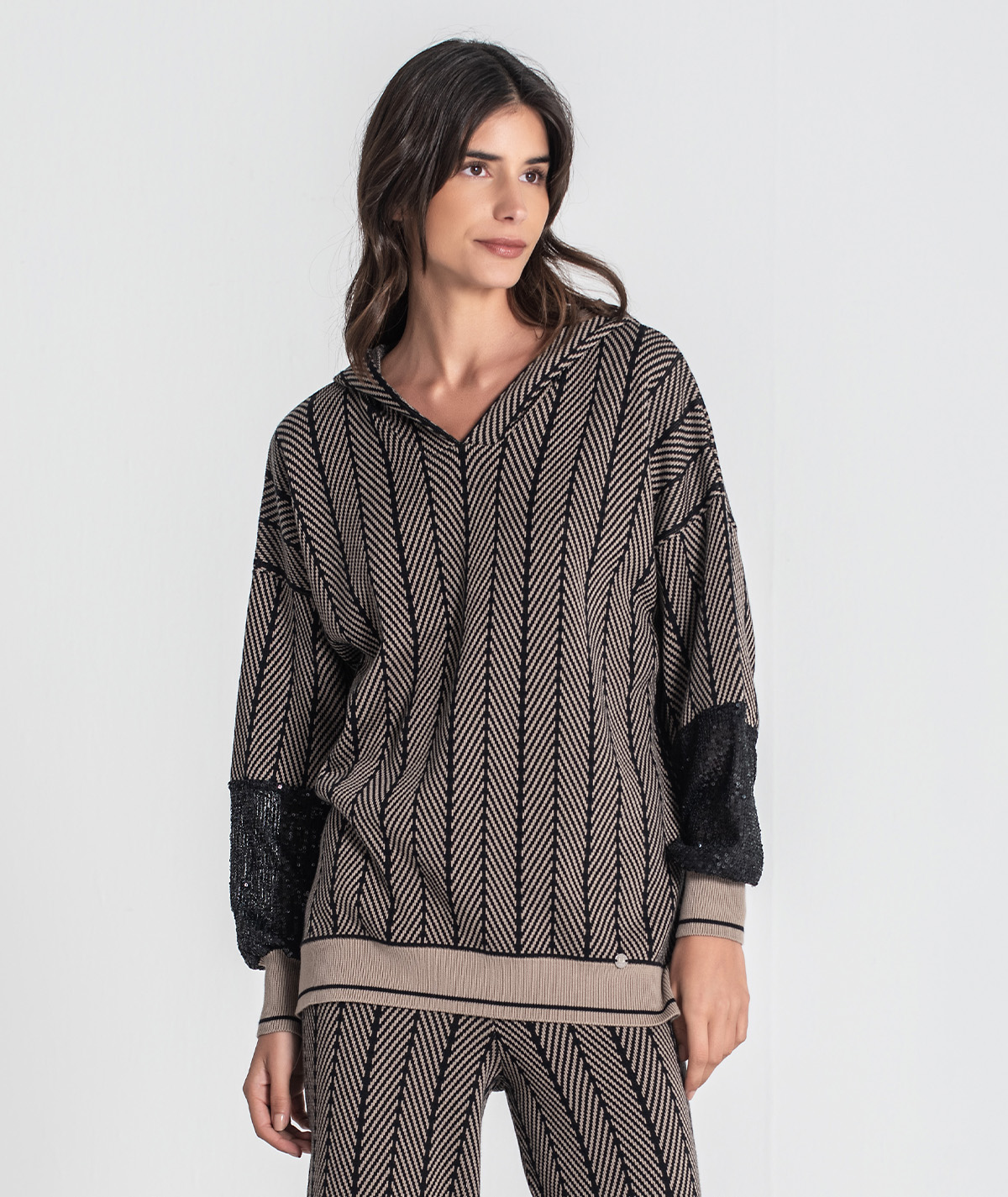 A Camisola RUGA 3477 é uma peça statement que combina conforto natural com brilho discreto. O corpo em malha jacquard alia textura e leveza, enquanto as mangas com lantejoulas trazem um toque sofisticado e moderno — perfeita para elevar looks casuais ou dar destaque a combinações mais elegantes.