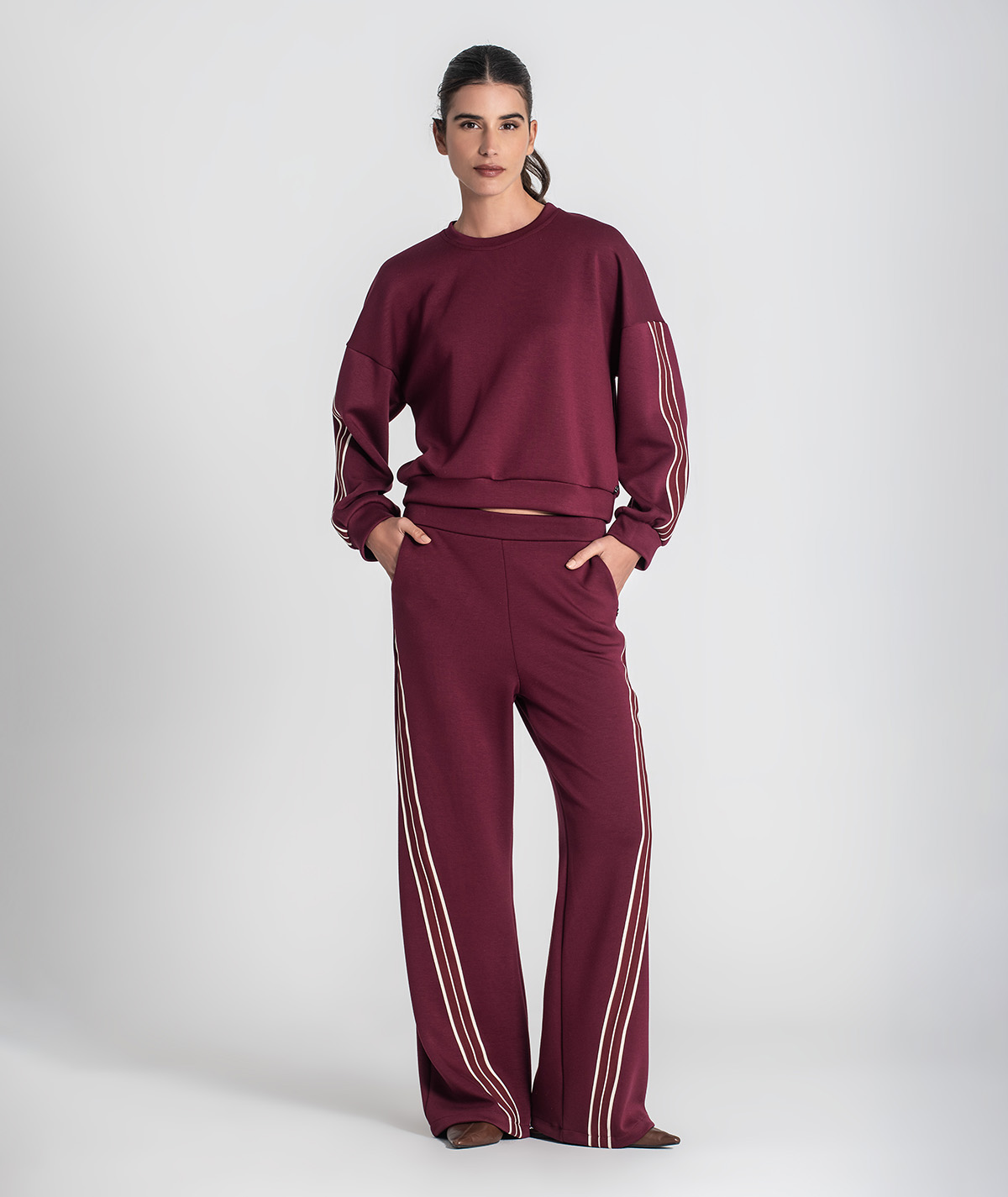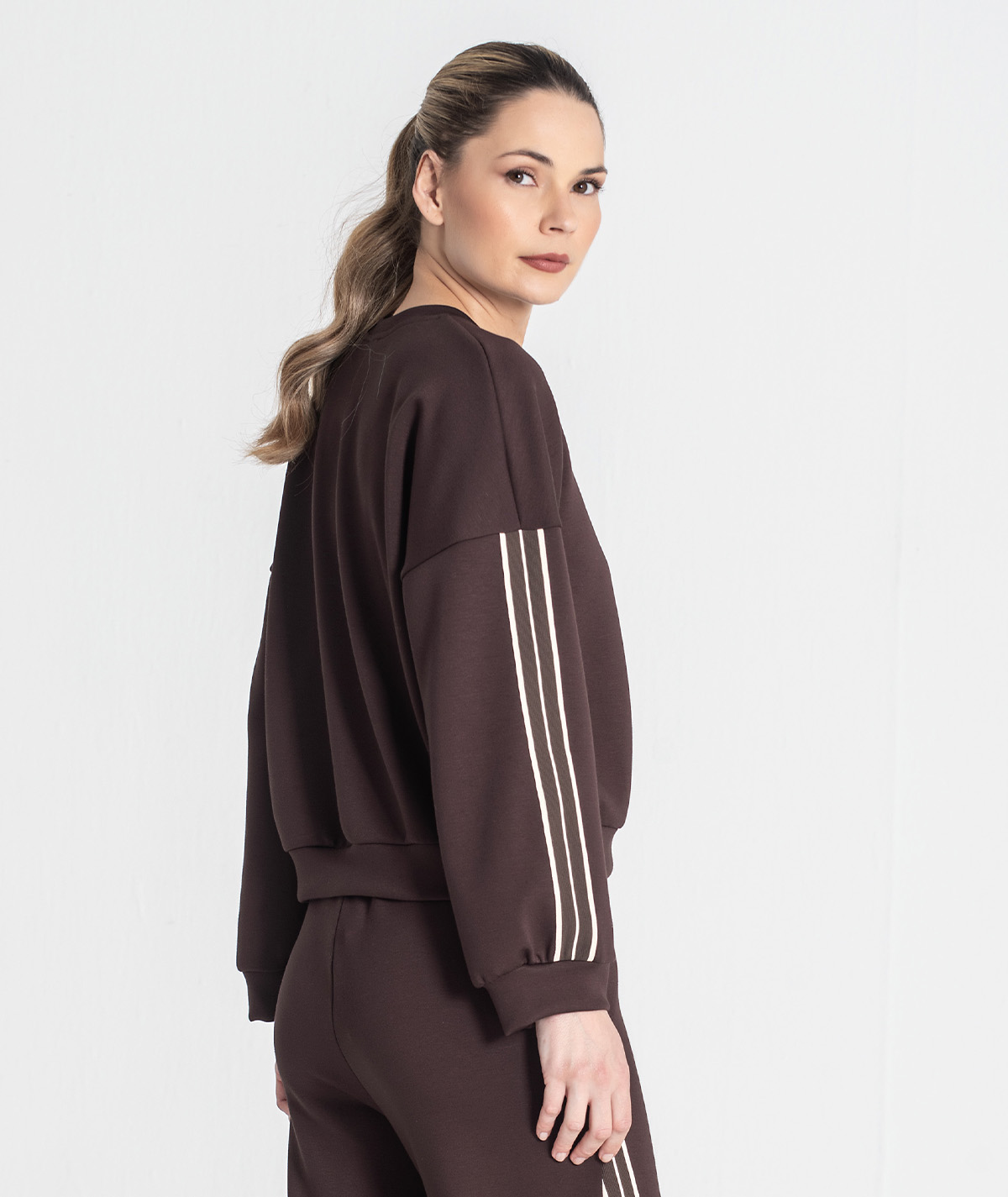 O destaque vai para a aplicação de tecido no fundo, que cria contraste e acrescenta um toque moderno e elegante à camisola.
