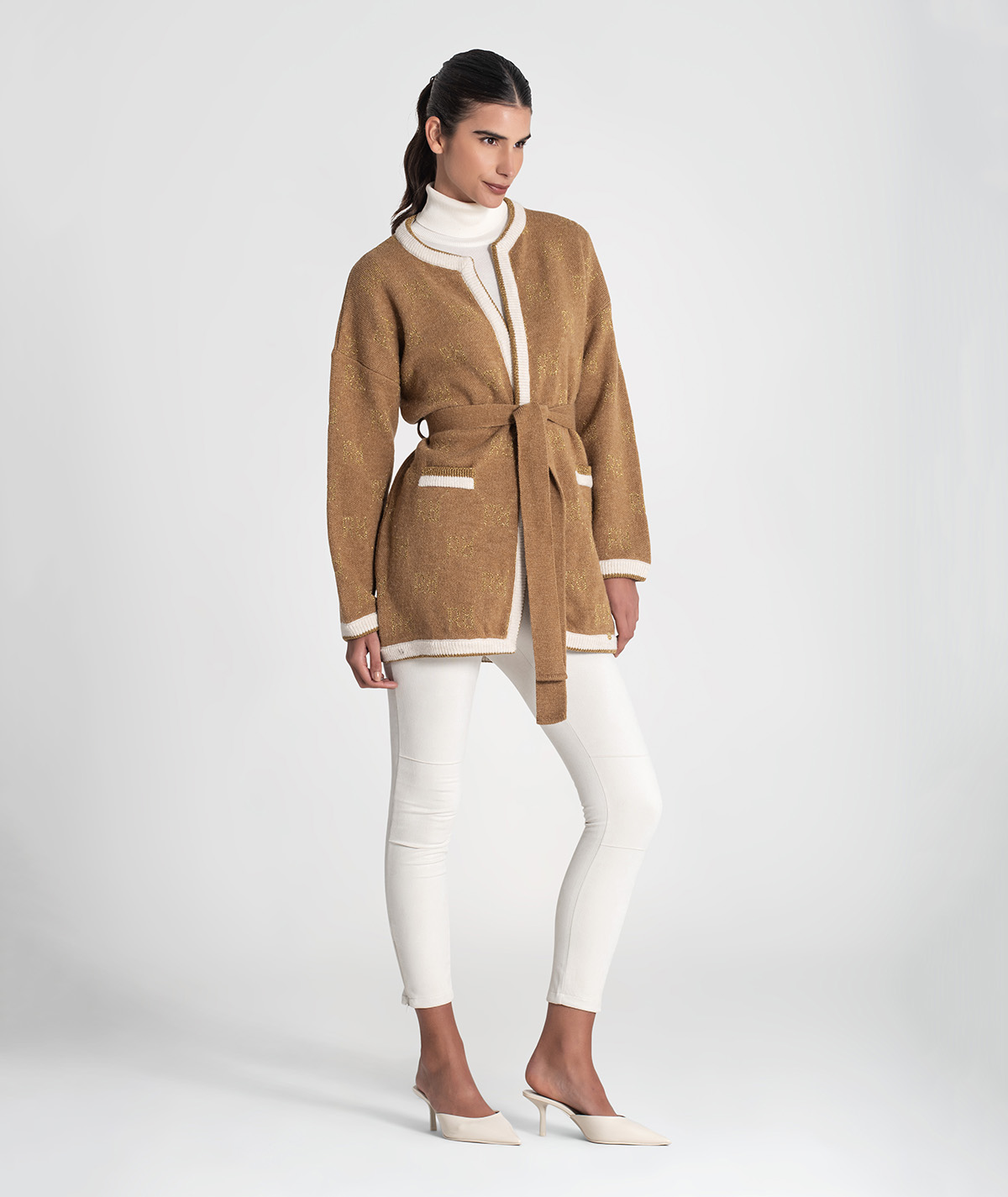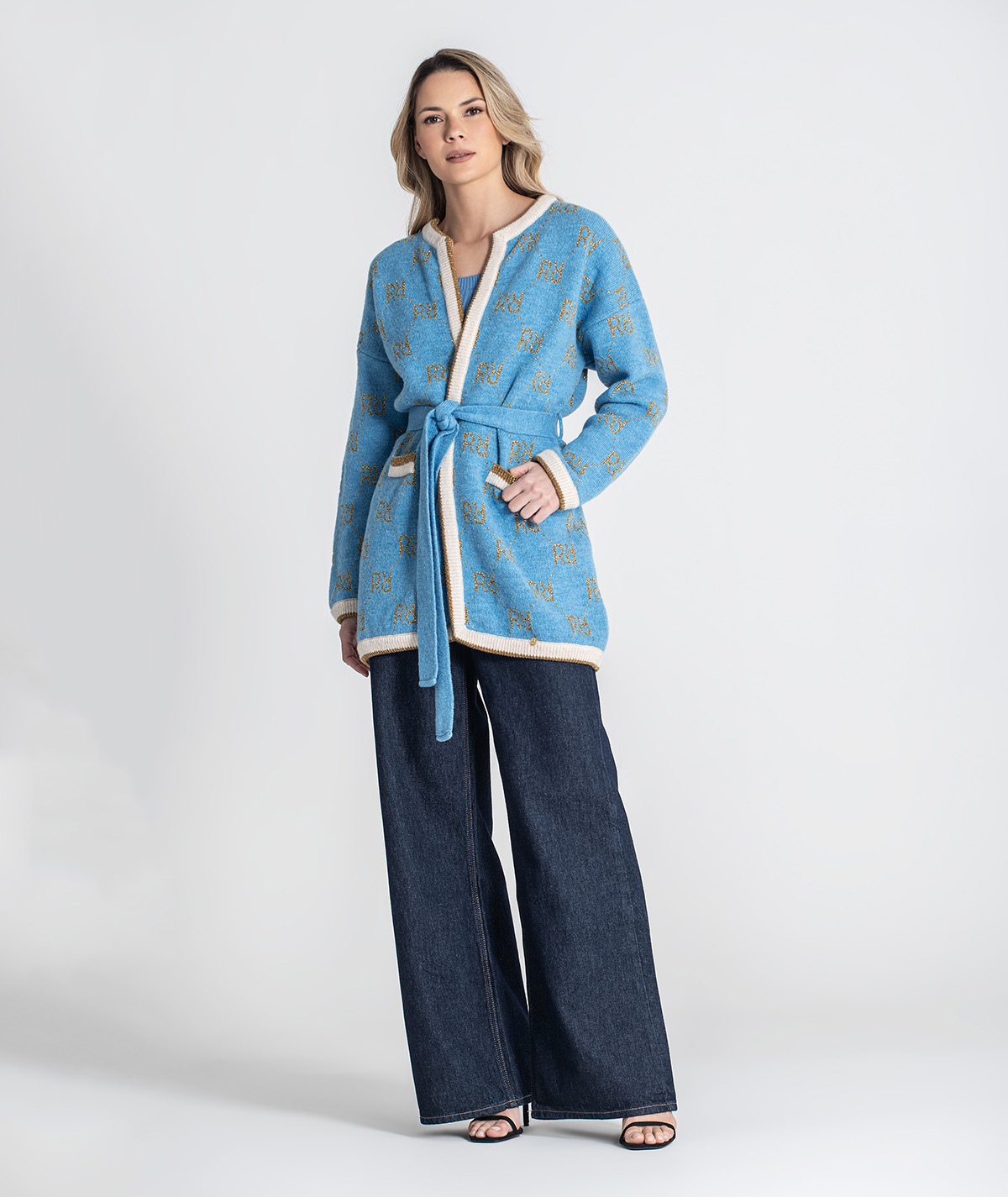 O Casaco Ruga 3455 é uma peça marcante que alia elegância e modernidade. Confecionado em tecido jacquard com padrão “rr” e efeito brilhante, destaca-se pelo seu visual sofisticado e pelo cuidado nos detalhes. O cinto amovível permite ajustar a peça à cintura, valorizando a silhueta e oferecendo versatilidade no uso — mais estruturado com cinto ou mais solto sem ele.