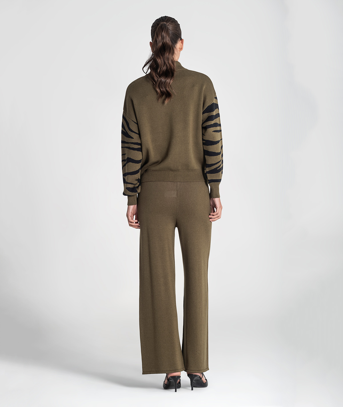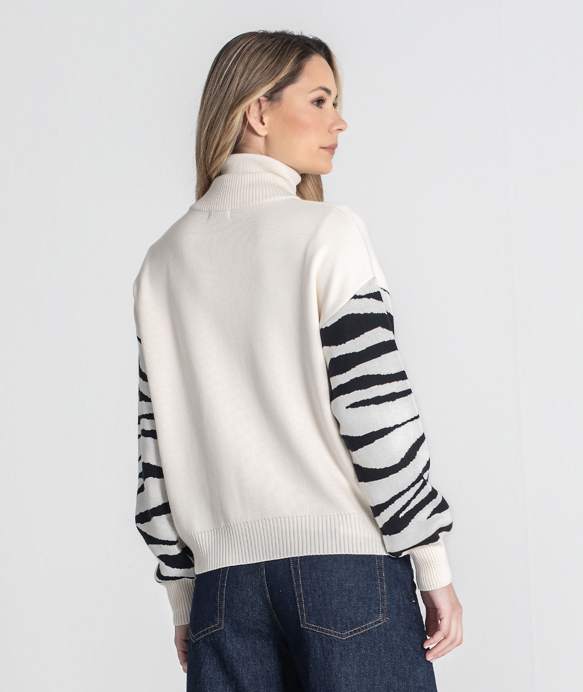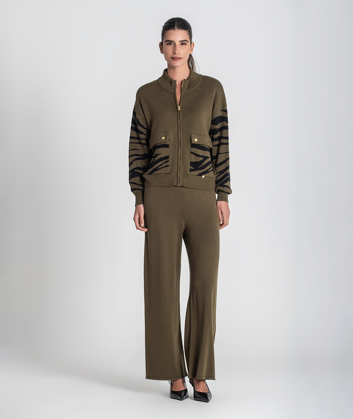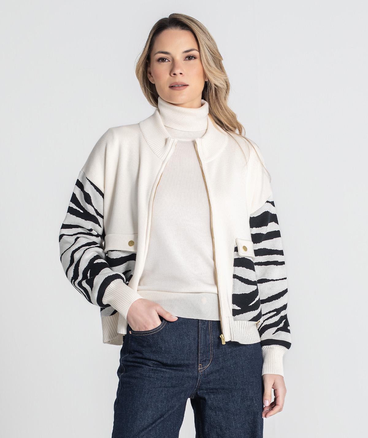 🧵 Design: detalhes em jacquard animal print nas mangas e nos bolsos, que realçam o contraste e o estilo