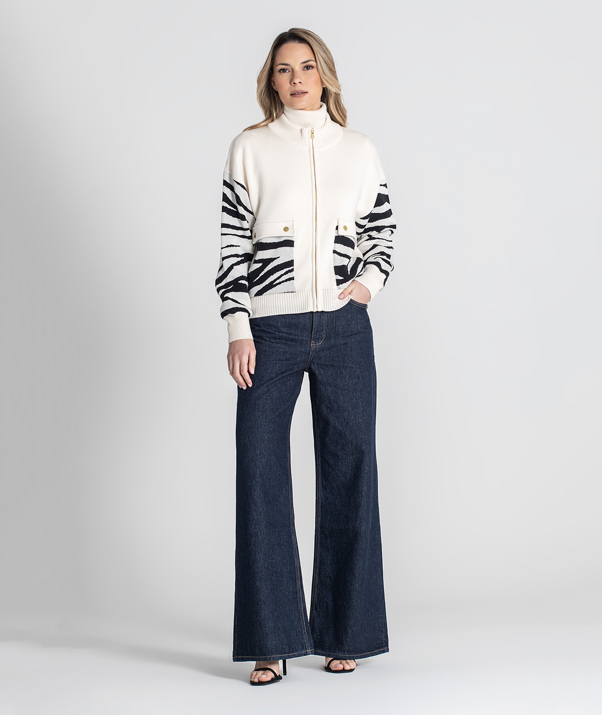 Este casaco distingue-se pelos detalhes em jacquard animal print, que acrescentam um toque moderno e irreverente ao visual. O fecho frontal e os bolsos práticos na frente tornam-no funcional sem perder elegância. Uma peça versátil que combina conforto e tendência, perfeita para o dia a dia.