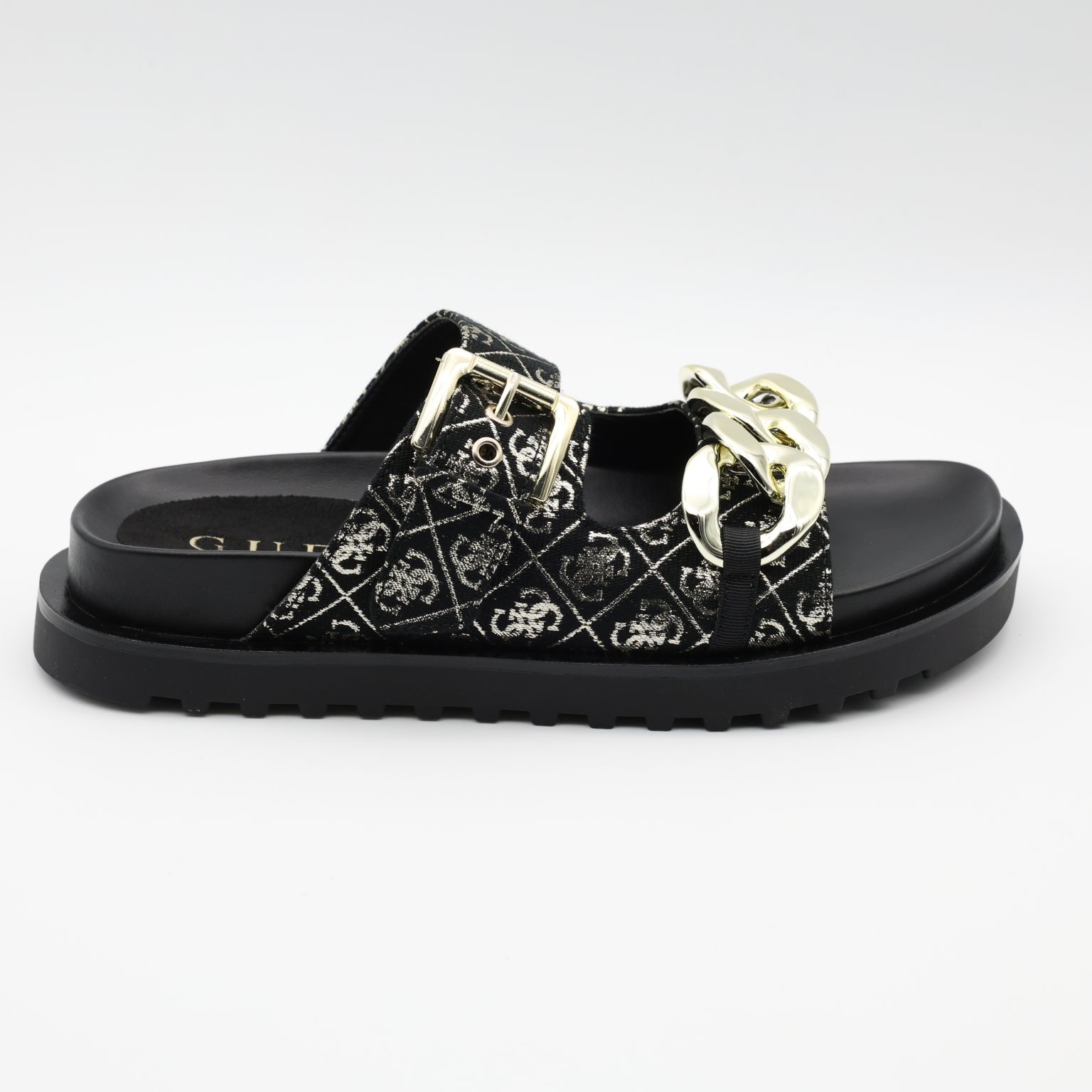 Os chinelos Fatema da GUESS combinam conforto descontraído com um visual moderno e cheio de atitude. Perfeitos para os dias de verão ou momentos de relax. Destacam-se pelos detalhes de assinatura da marca, conferindo-lhes um toque fashion mesmo em looks mais casuais.