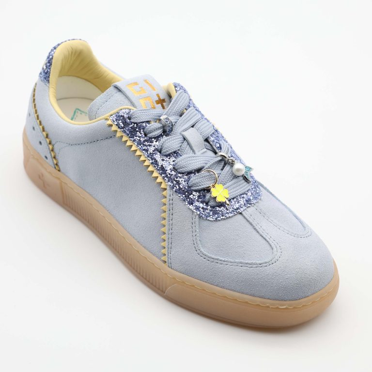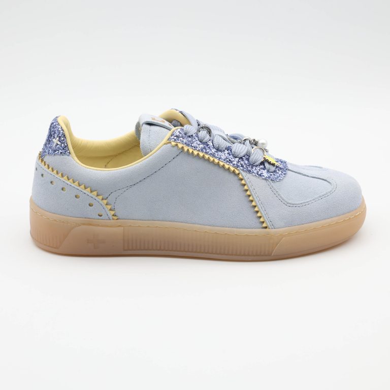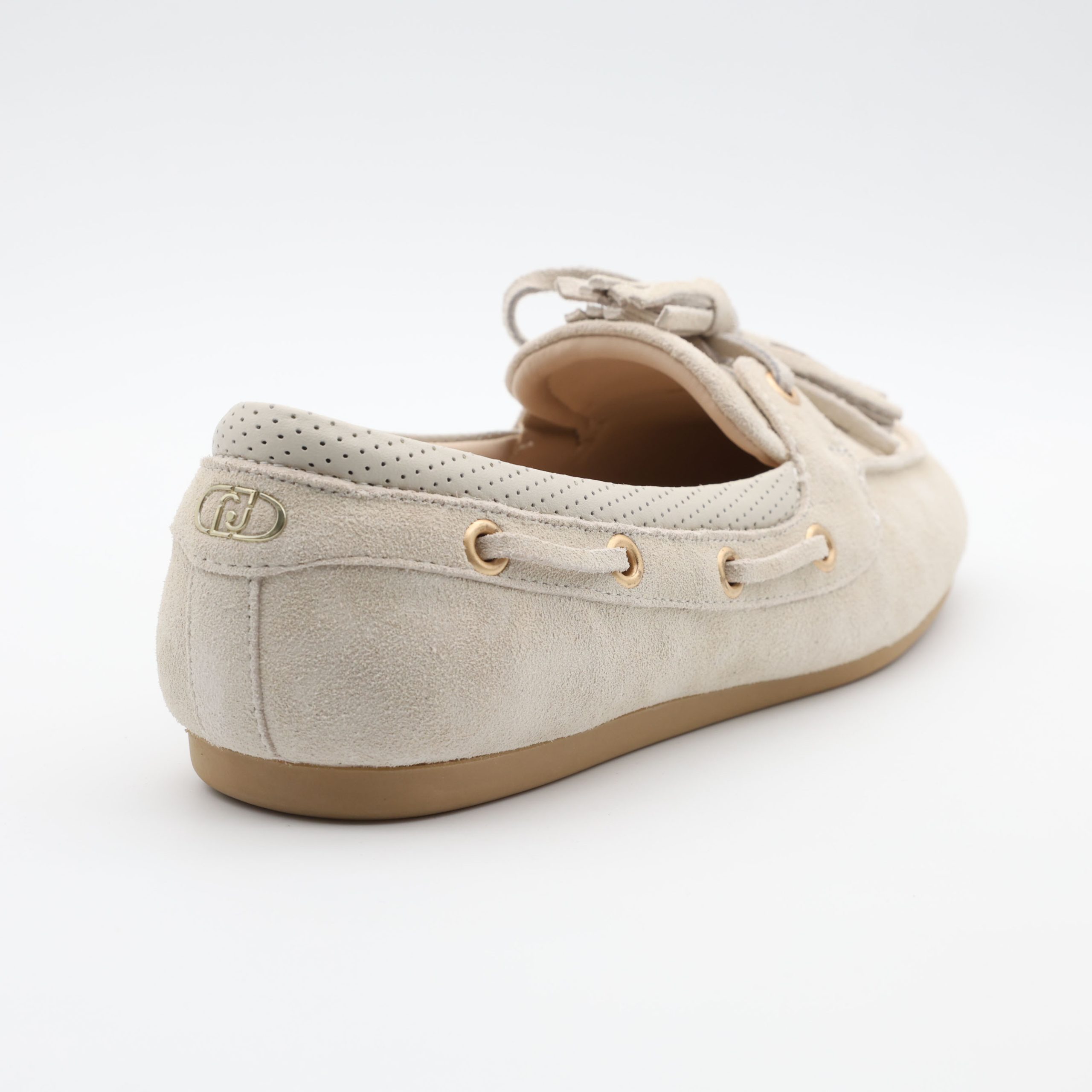👞 Exterior: parte superior em camurça macia com perfurações decorativas e cordão com ilhós metálicos que percorre o contorno do modelo