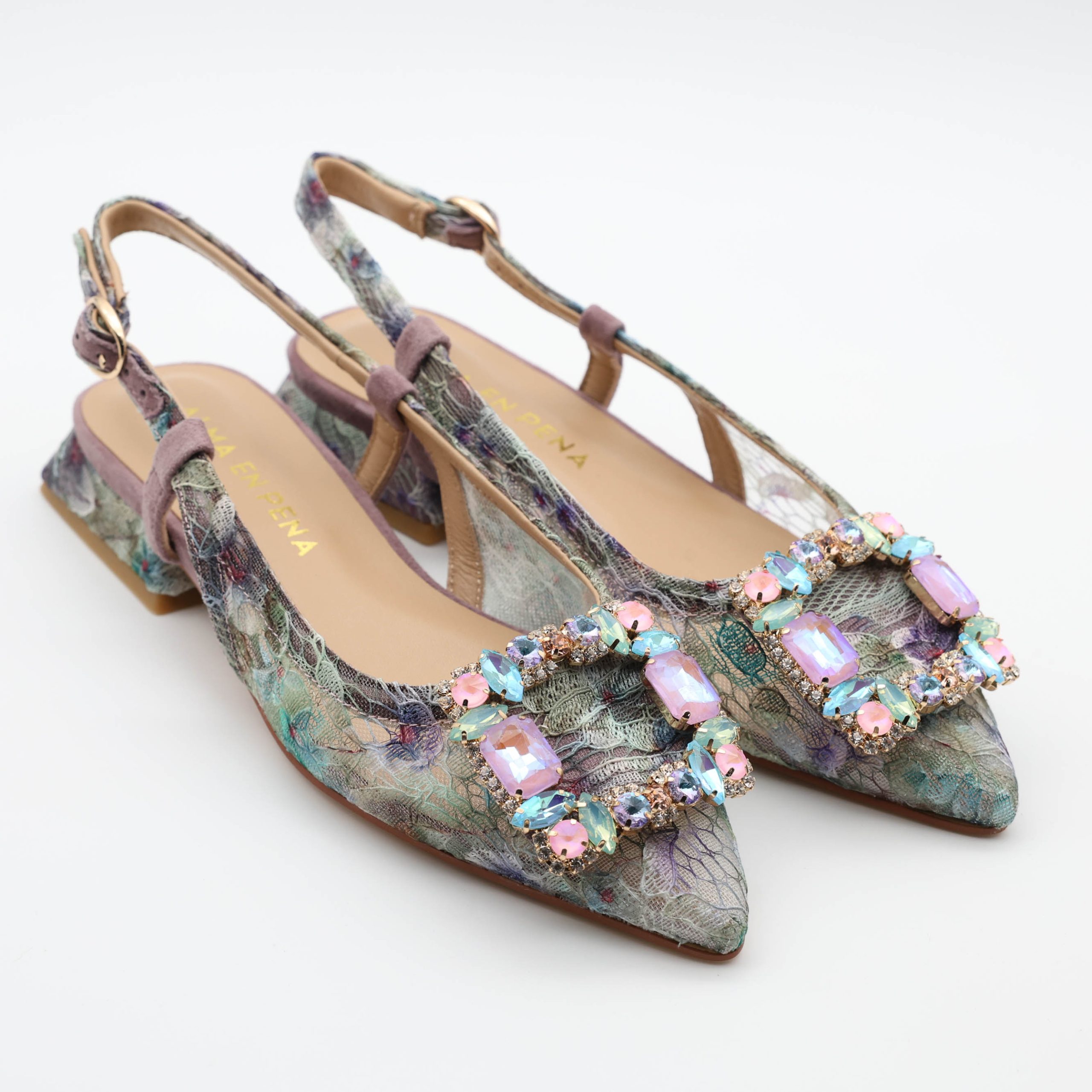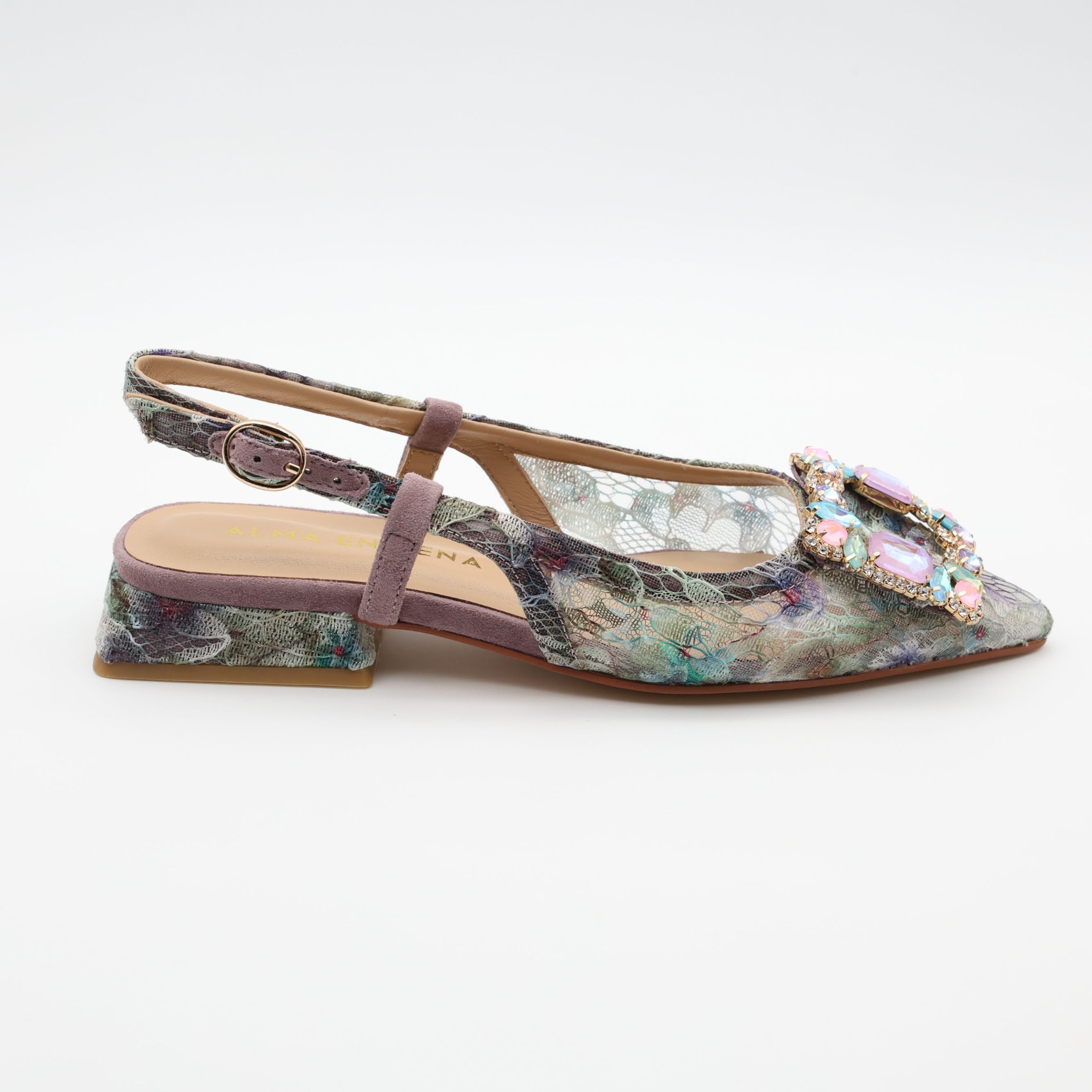 As sabrinas V261006 da Alma en Pena destacam-se pelo design slingback com padrão floral. As aplicações em pedras criam um visual sofisticado e feminino. Assim, são ideais para ocasiões especiais.