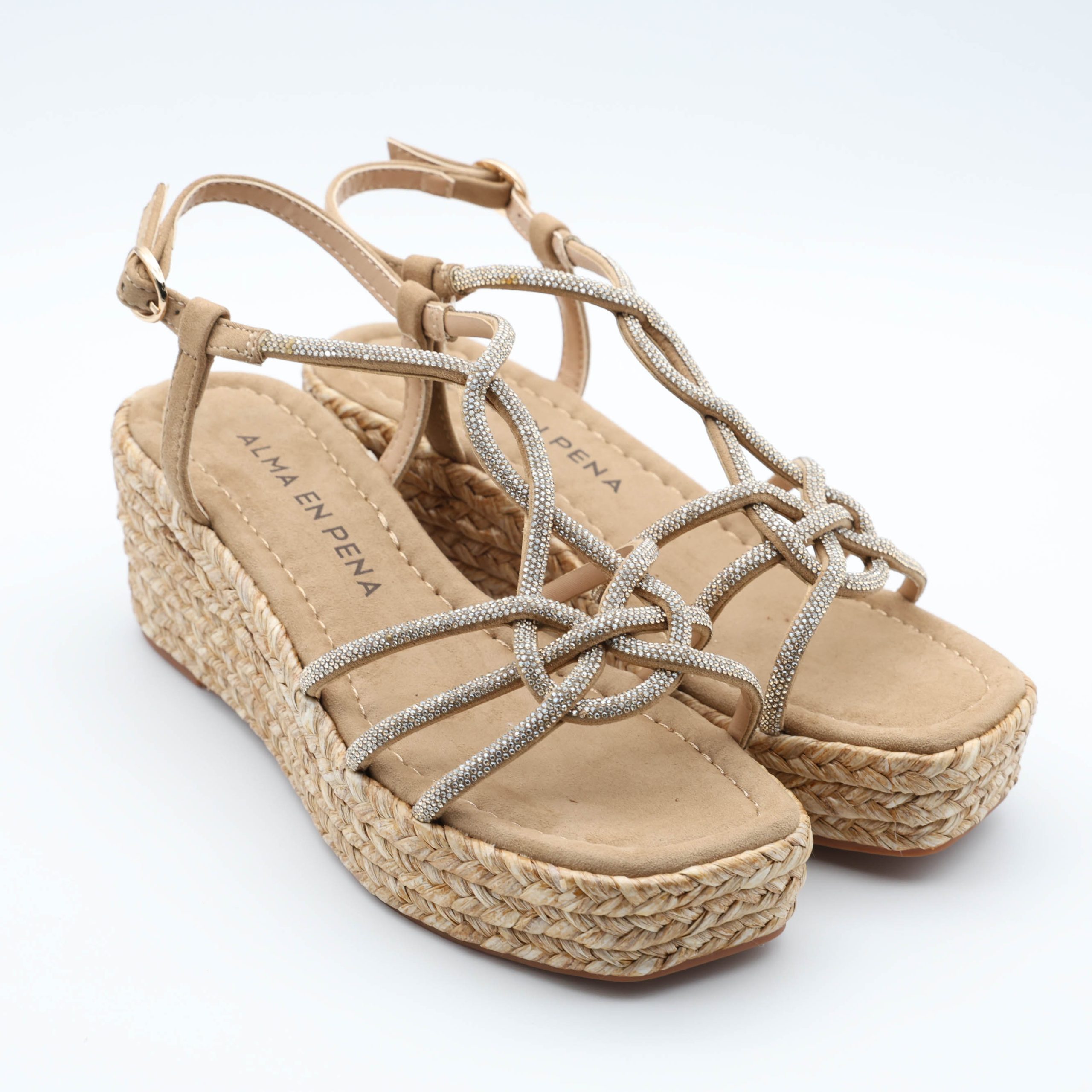 As sandálias V2650752 da Alma en Pena destacam-se pelo design em cunha com efeito entrançado. As tiras finas com brilho criam um visual feminino e sofisticado. Assim, são ideais para ocasiões especiais.