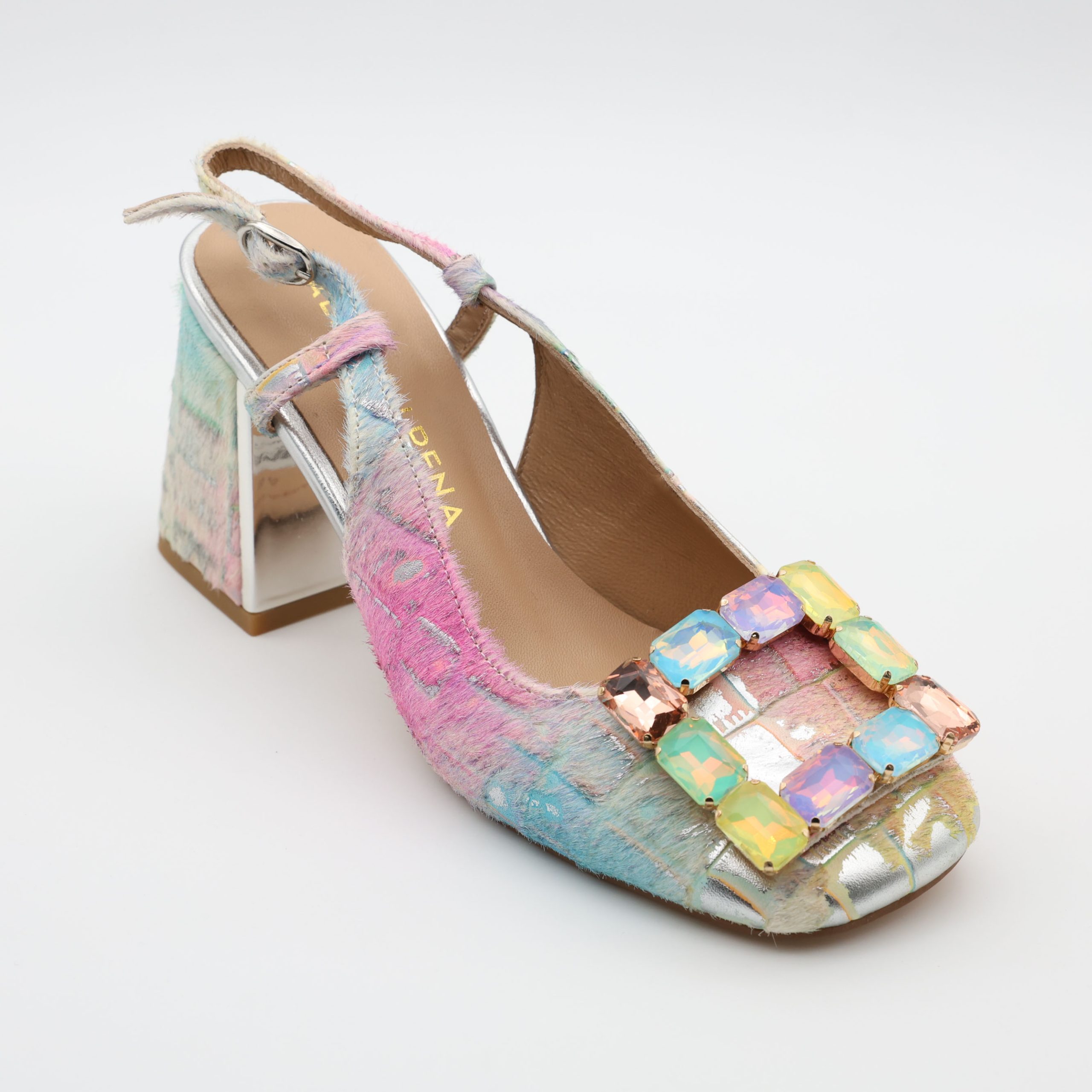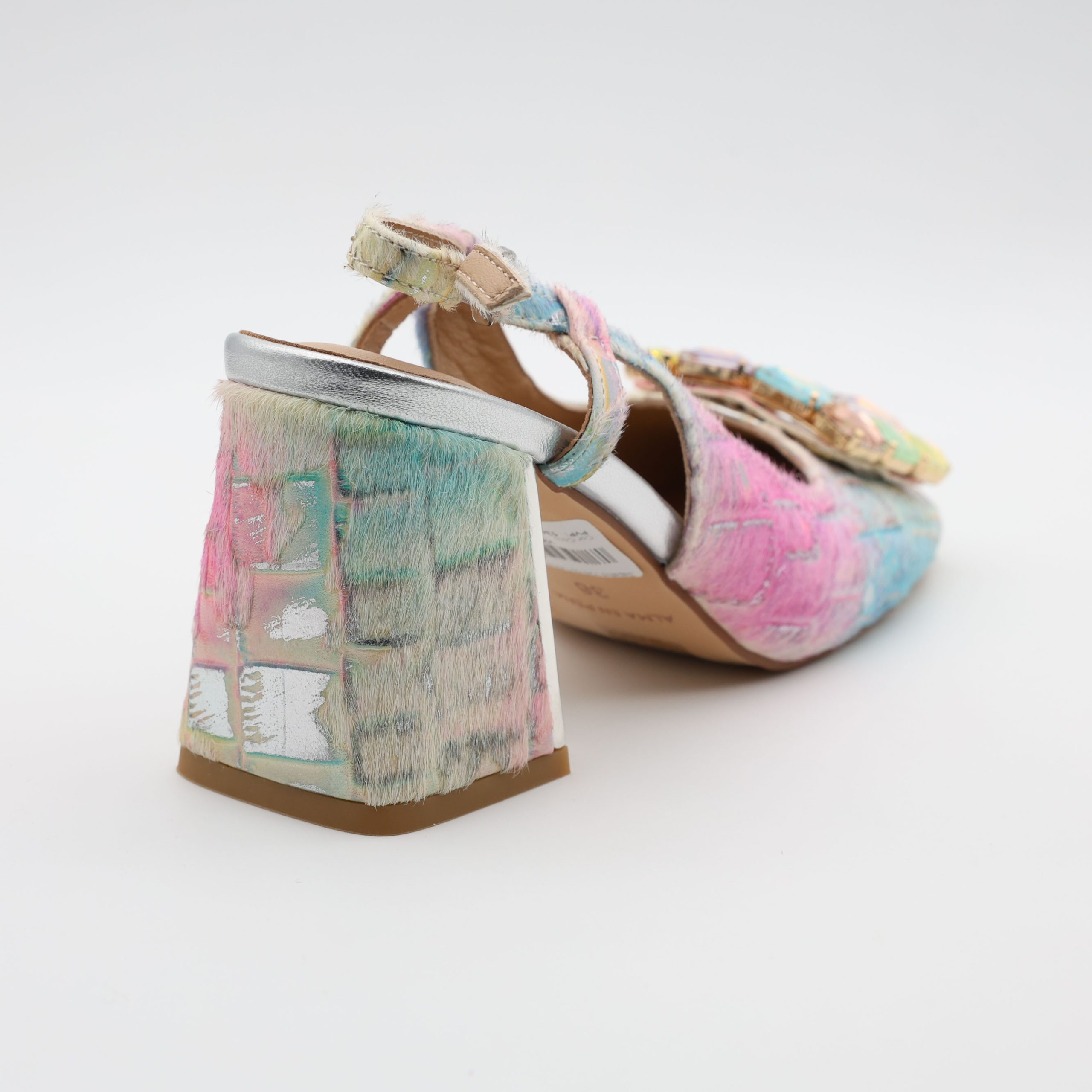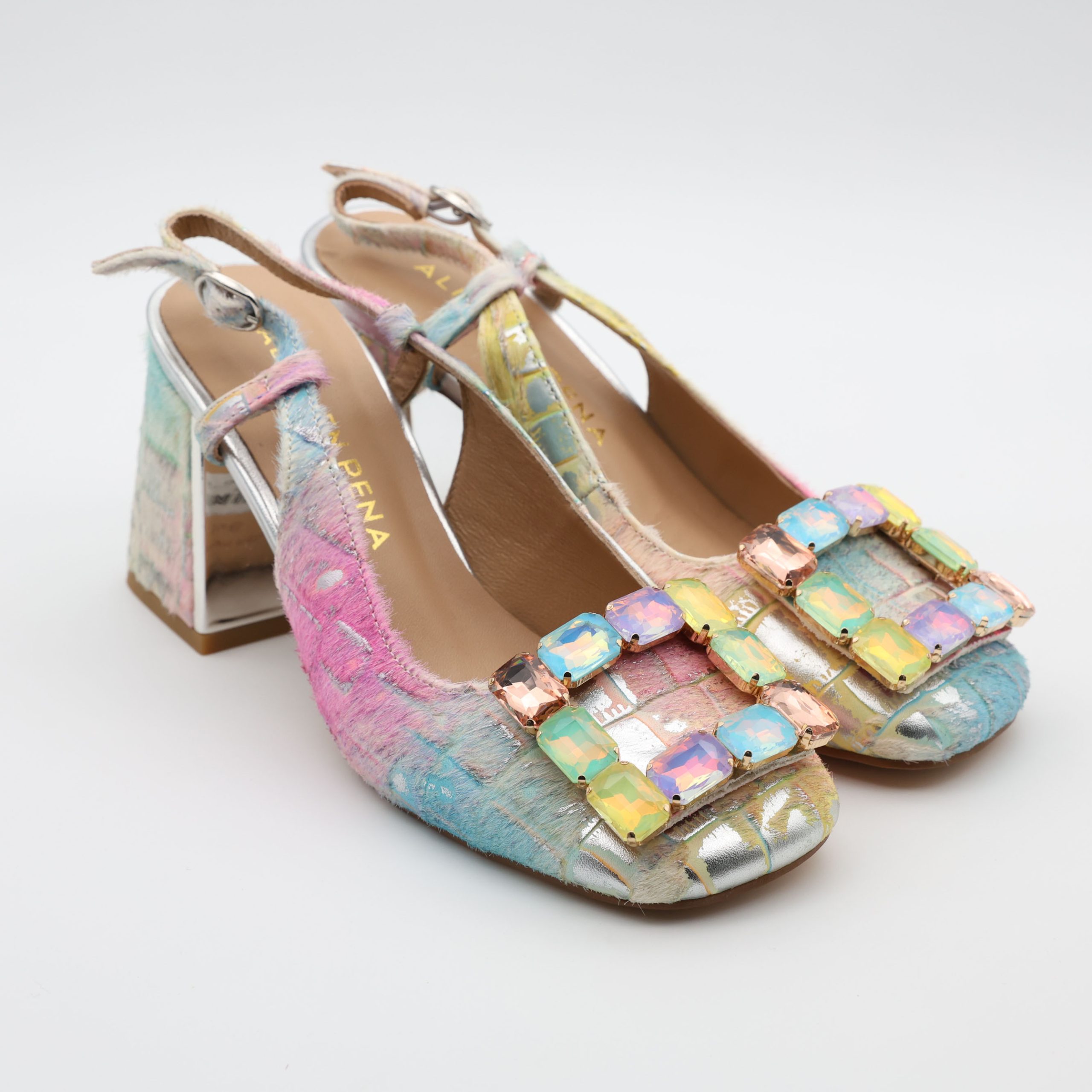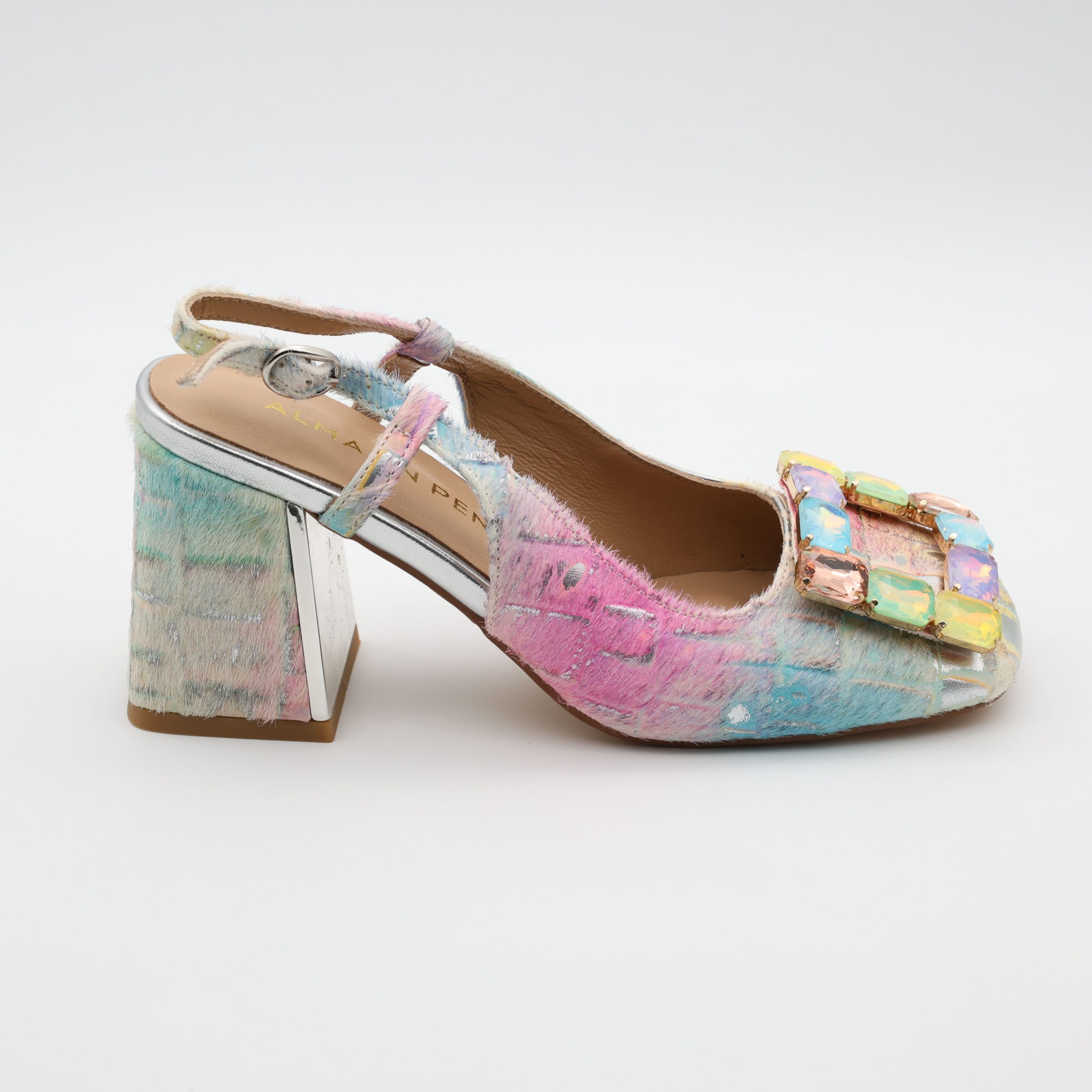 Os sapatos V261501 da Alma en Pena destacam-se pelo padrão multicolorido e pelas aplicações em pedras. O design cria um visual único e marcante. Assim, são ideais para ocasiões especiais.