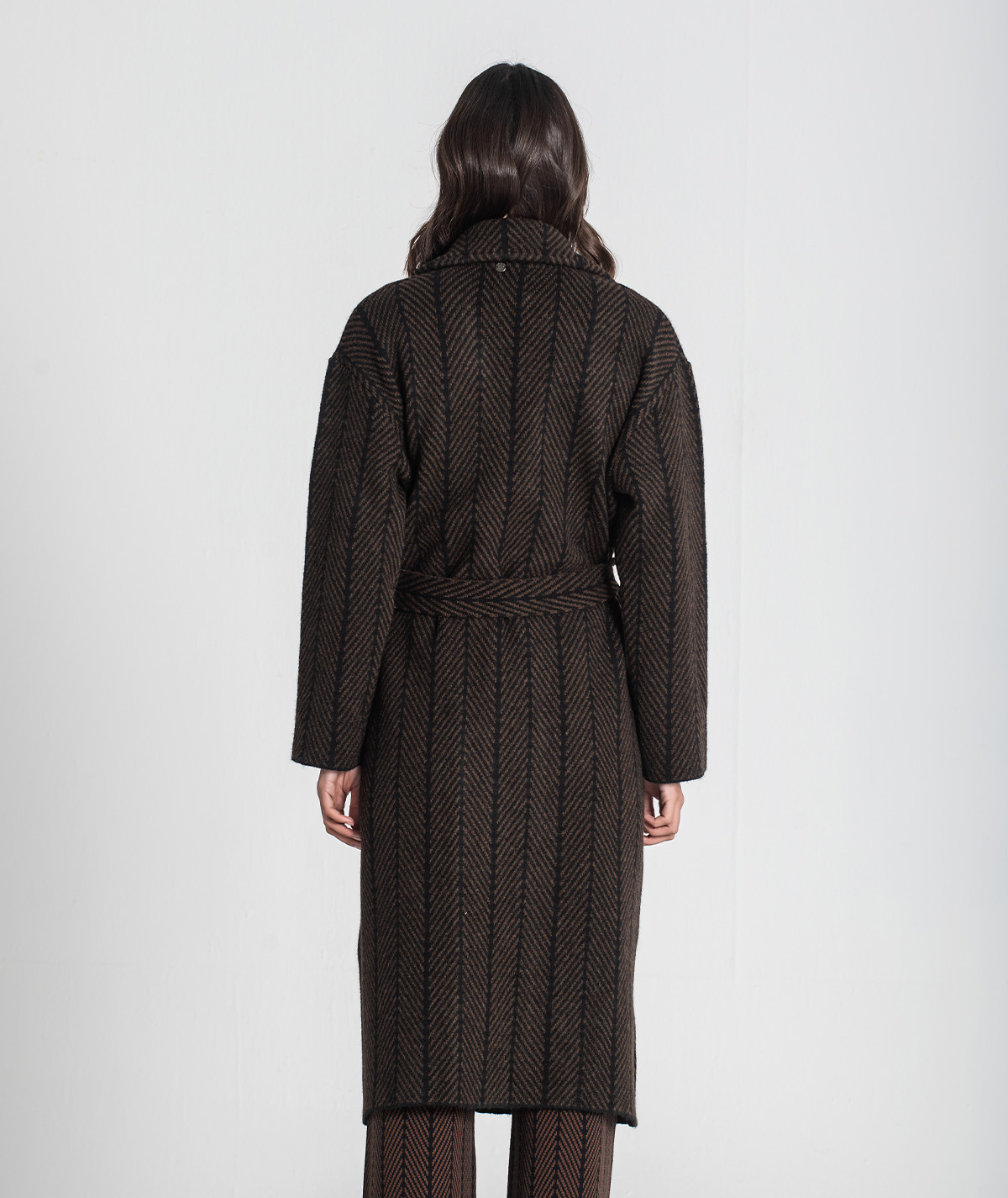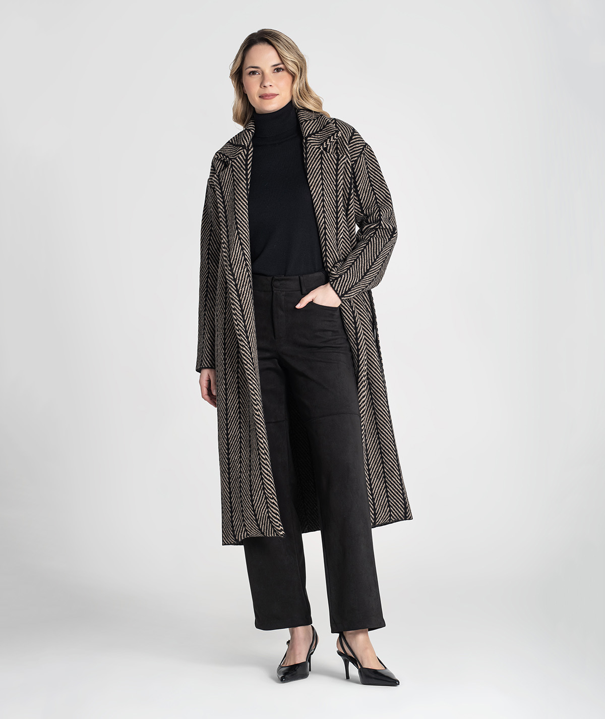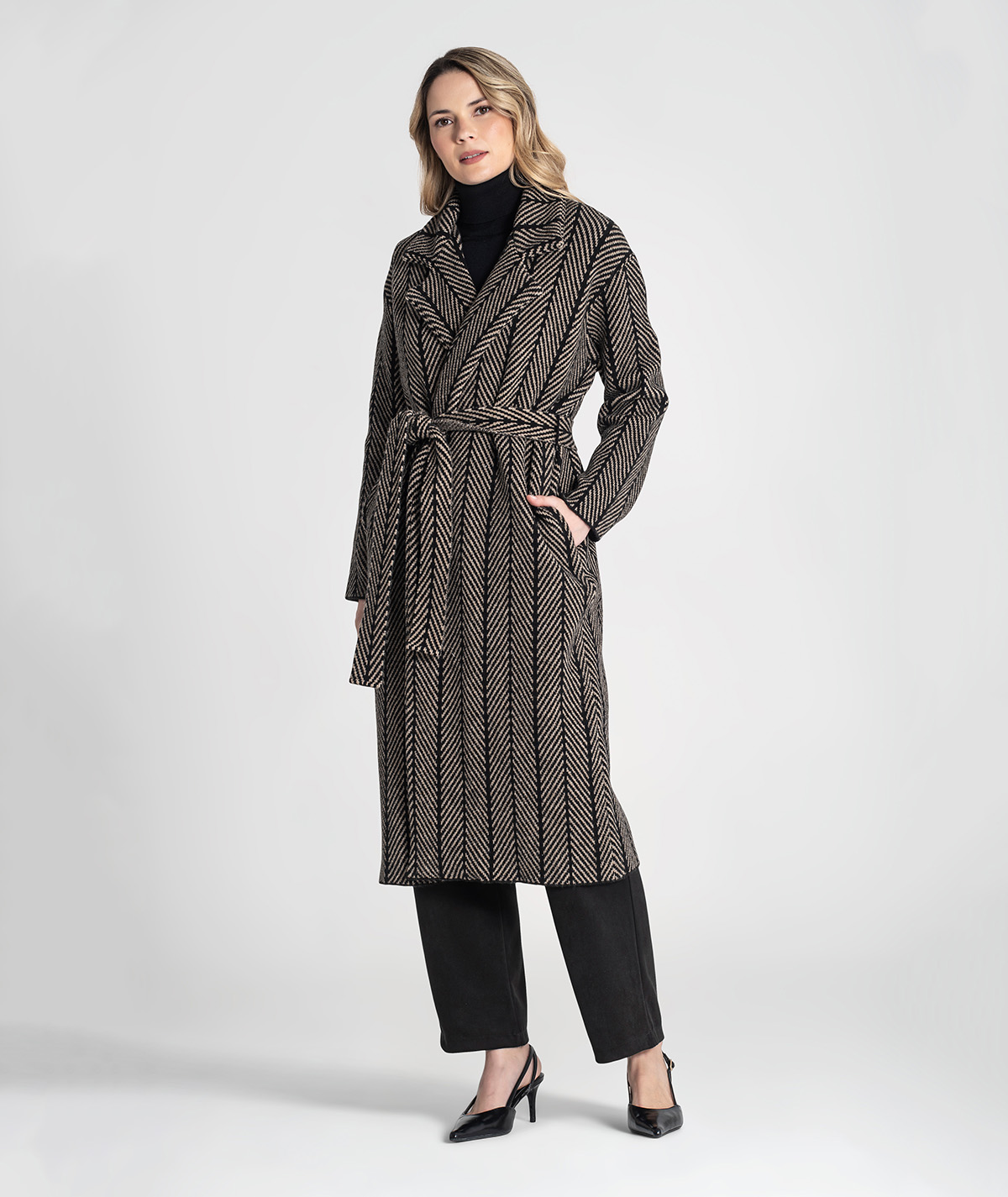 Elegante e sofisticado, este sobretudo destaca-se pelo tecido jacquard com padrão espinha, que lhe confere textura e distinção. O cinto amovível permite ajustar a cintura, valorizando a silhueta sem perder o conforto. Uma peça versátil e intemporal, ideal para dias mais frios com estilo.
