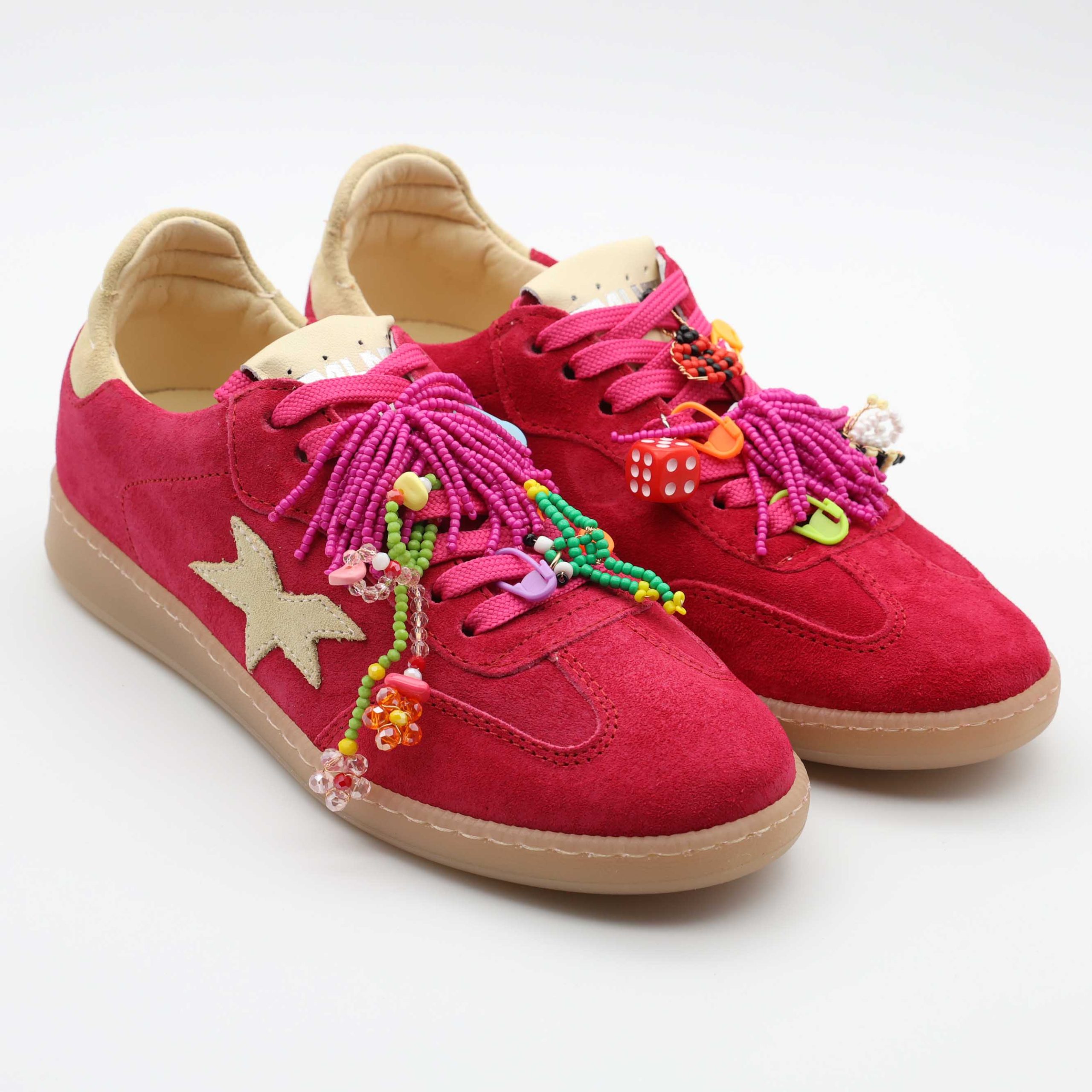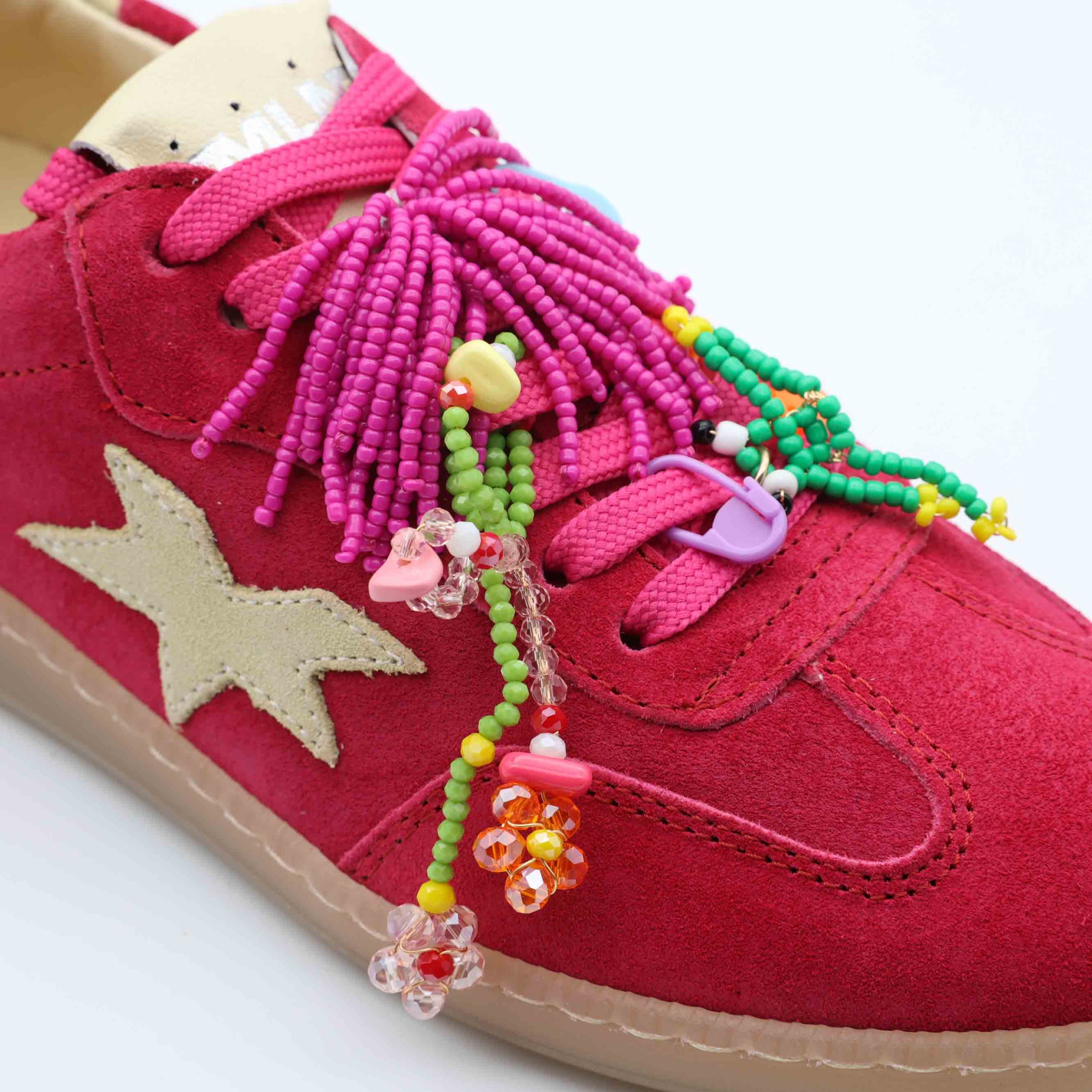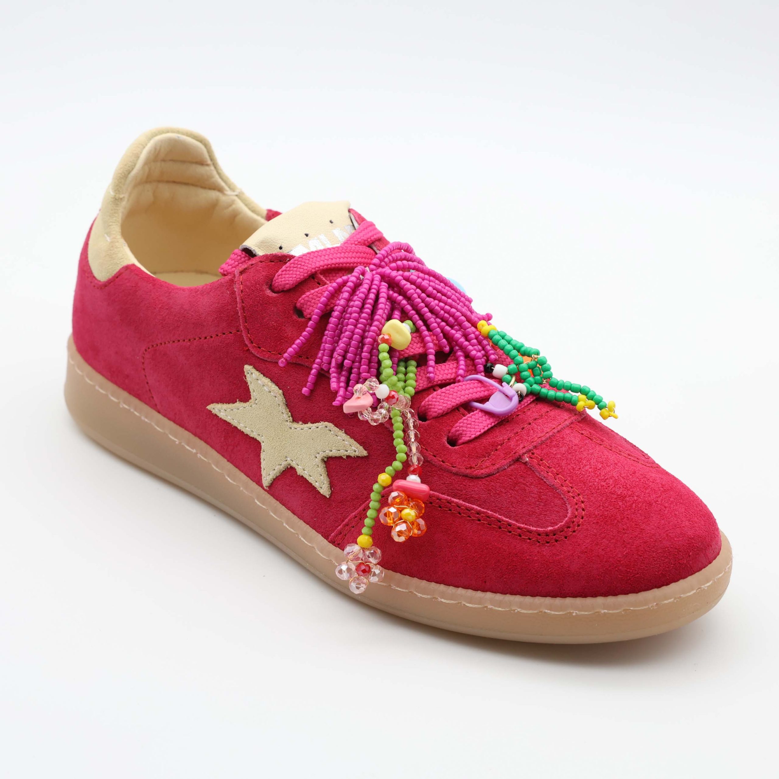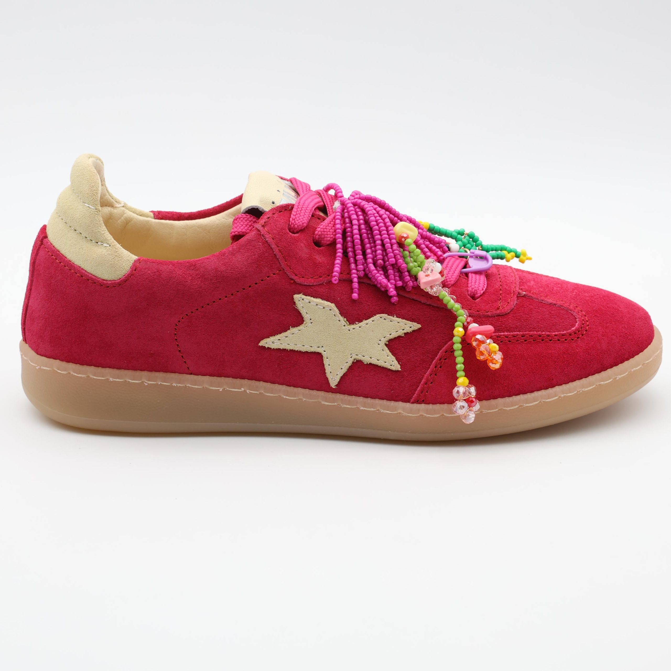 👟 Exterior: parte superior em camurça macia com acabamento suave, enriquecida com aplicações decorativas, missangas coloridas e detalhe lateral em forma de estrela