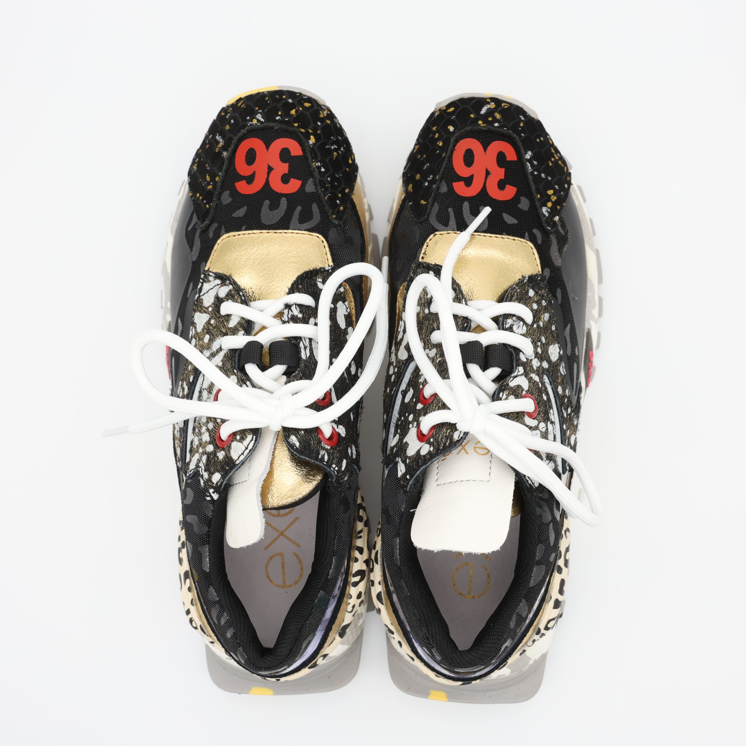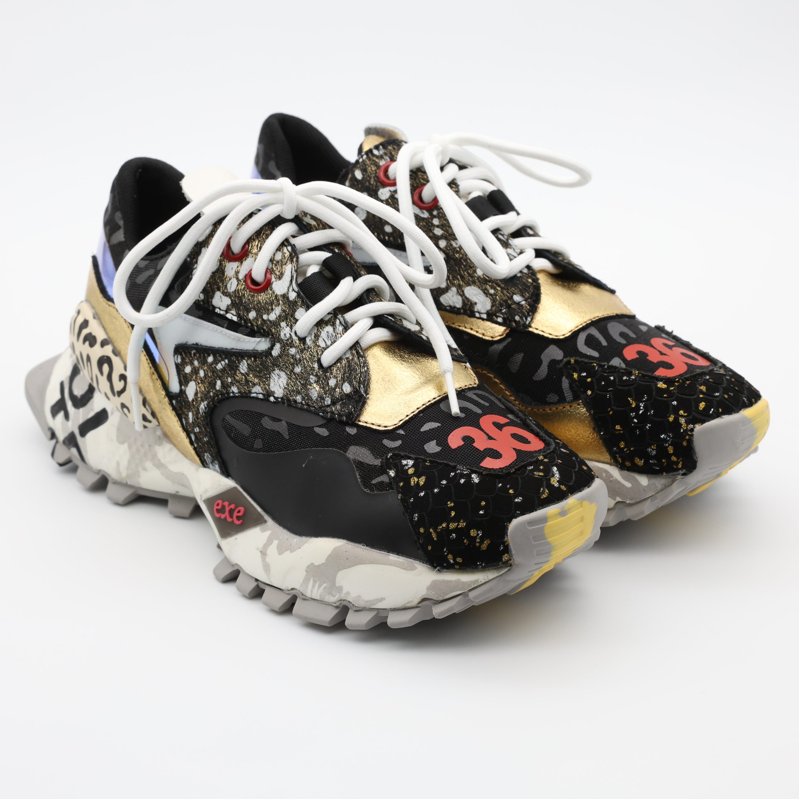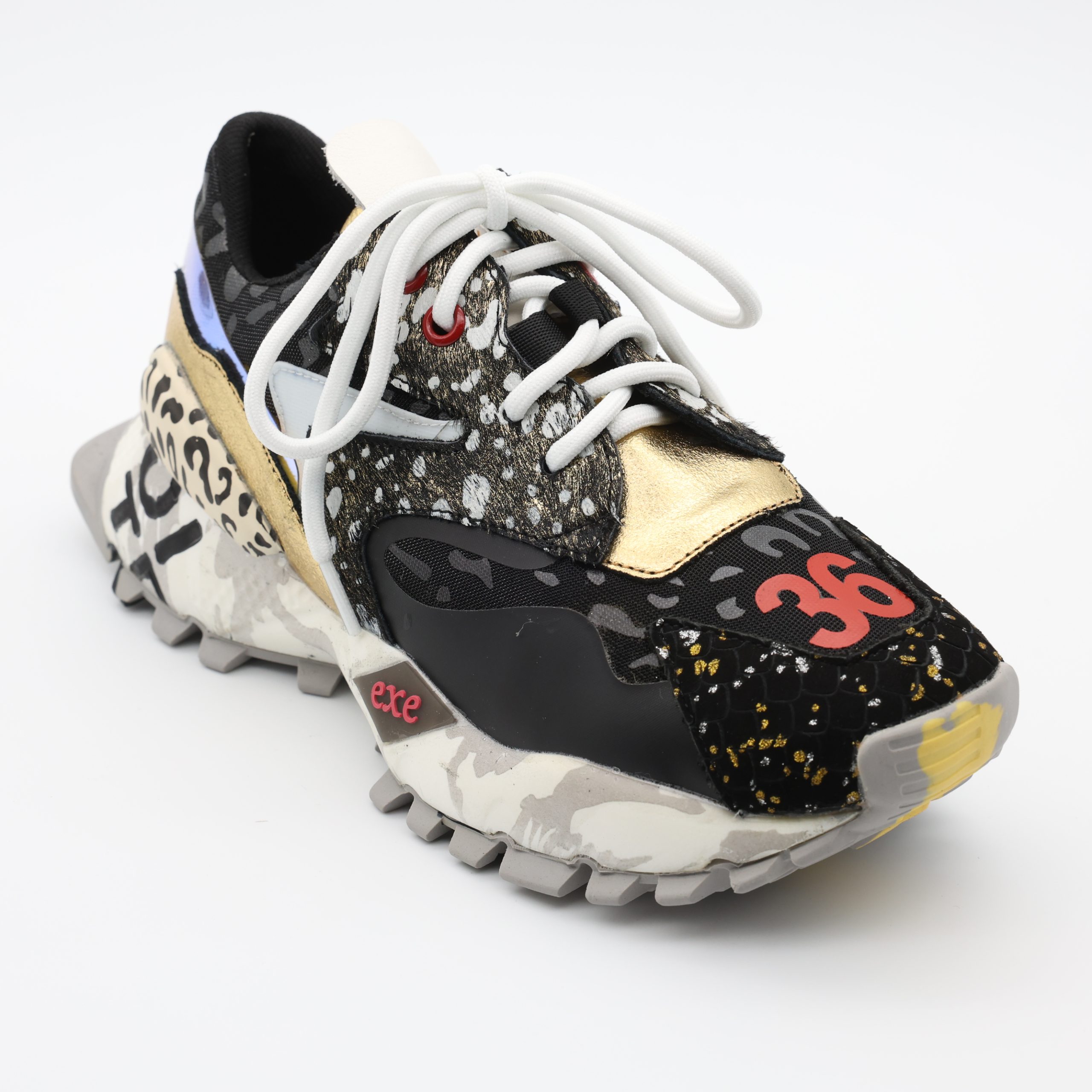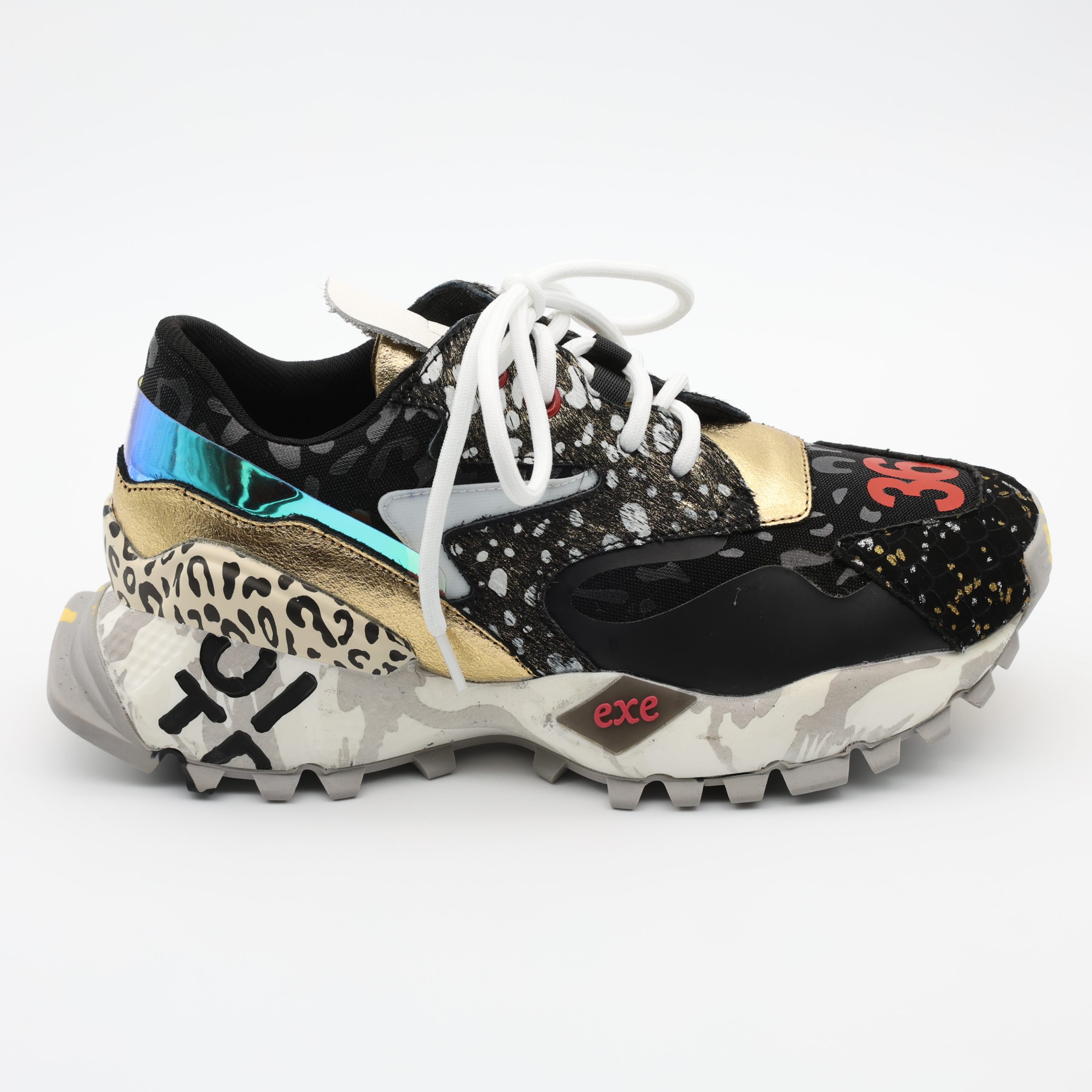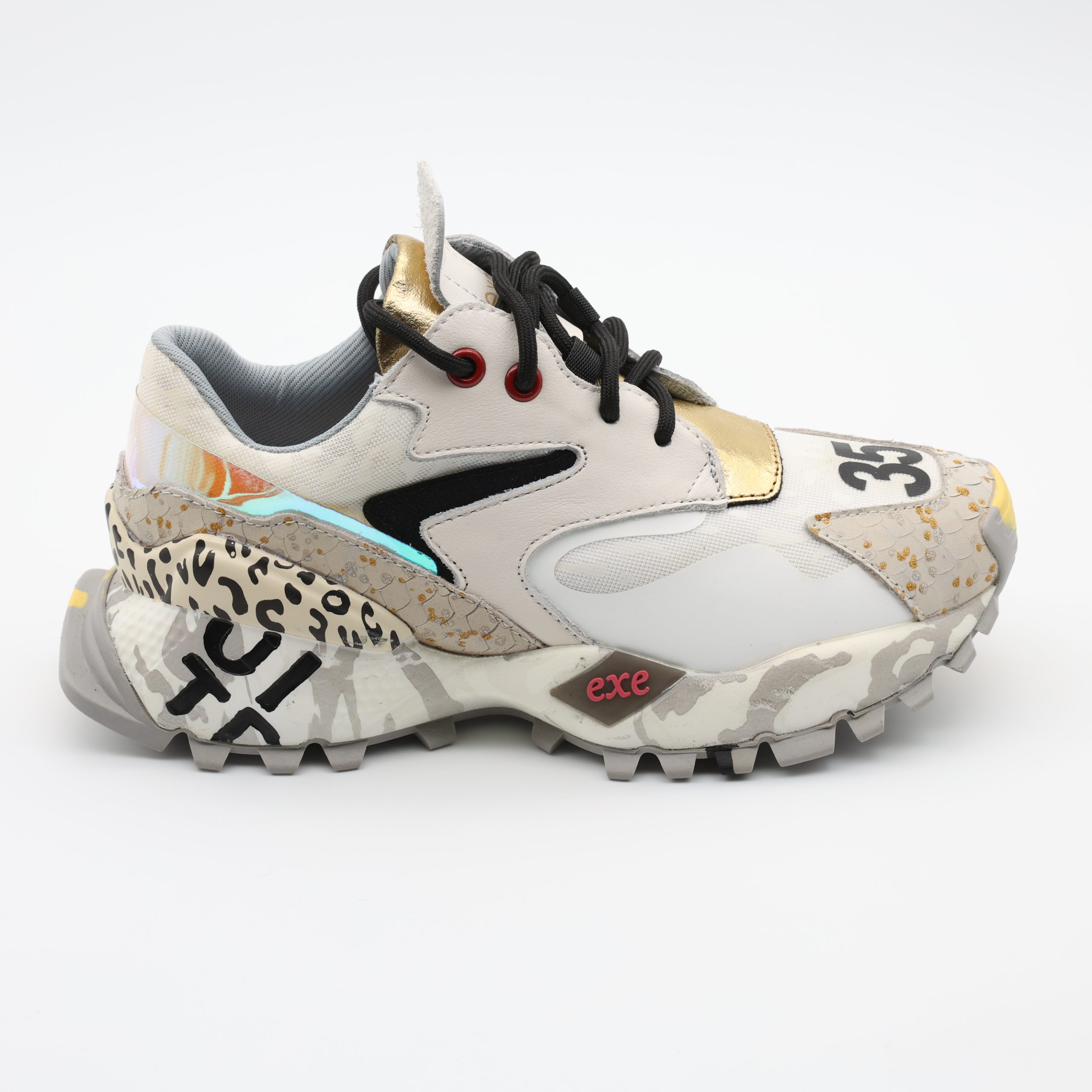 EXÉ 134-26 – Um mix de pele, tecido e detalhes holográficos que dão brilho moderno ao look. A sola robusta multicolorida garante conforto e atitude em cada passo.