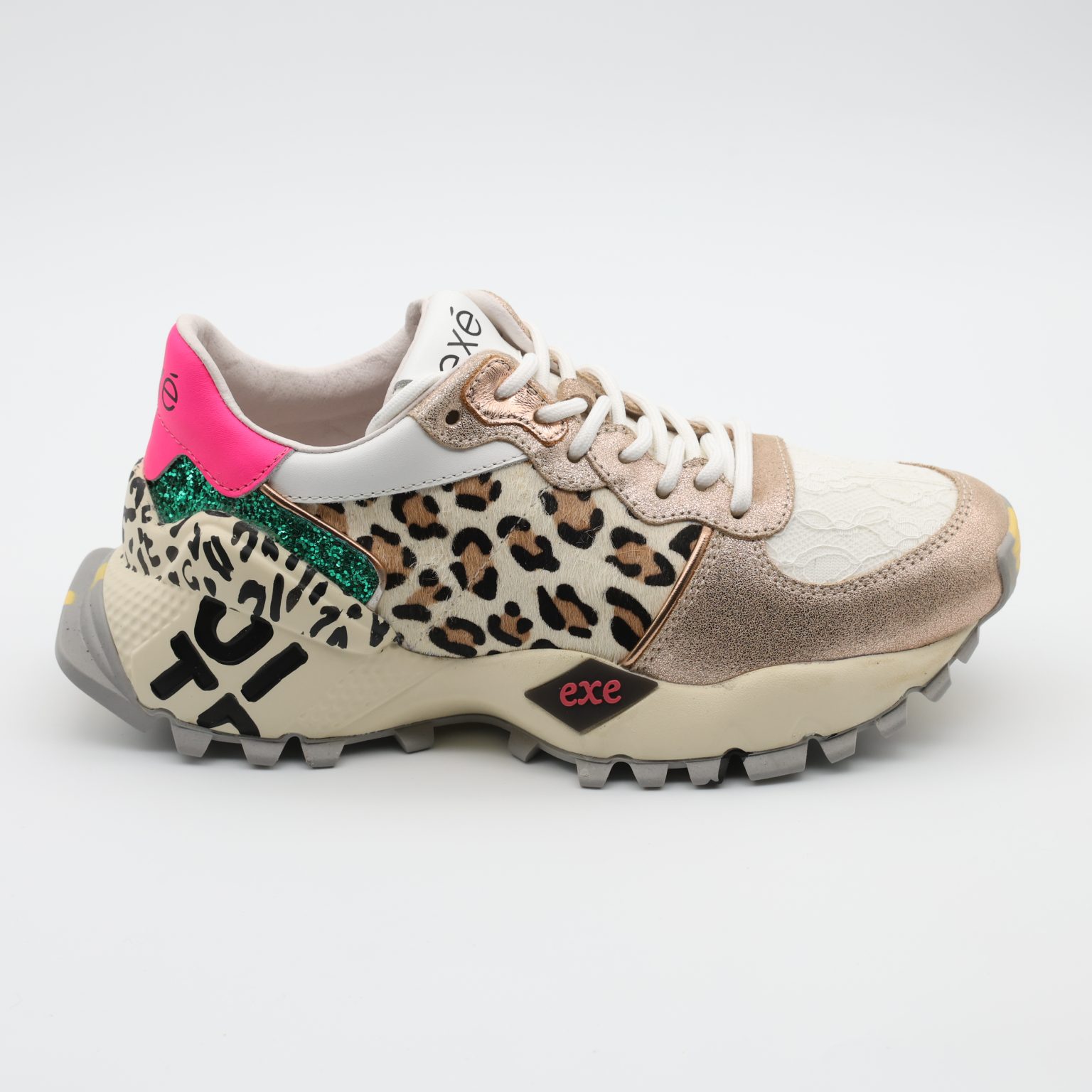 O modelo EXÉ 134-350 combina a força do padrão leopard com a sofisticação do tom champagne, criando um ténis urbano com identidade única. O exterior mistura pele genuína e tecido, enriquecido com aplicações de glitter e lantejoulas douradas que iluminam discretamente o visual, tornando-o perfeito para looks casuais com atitude ou coordenados mais arrojados.