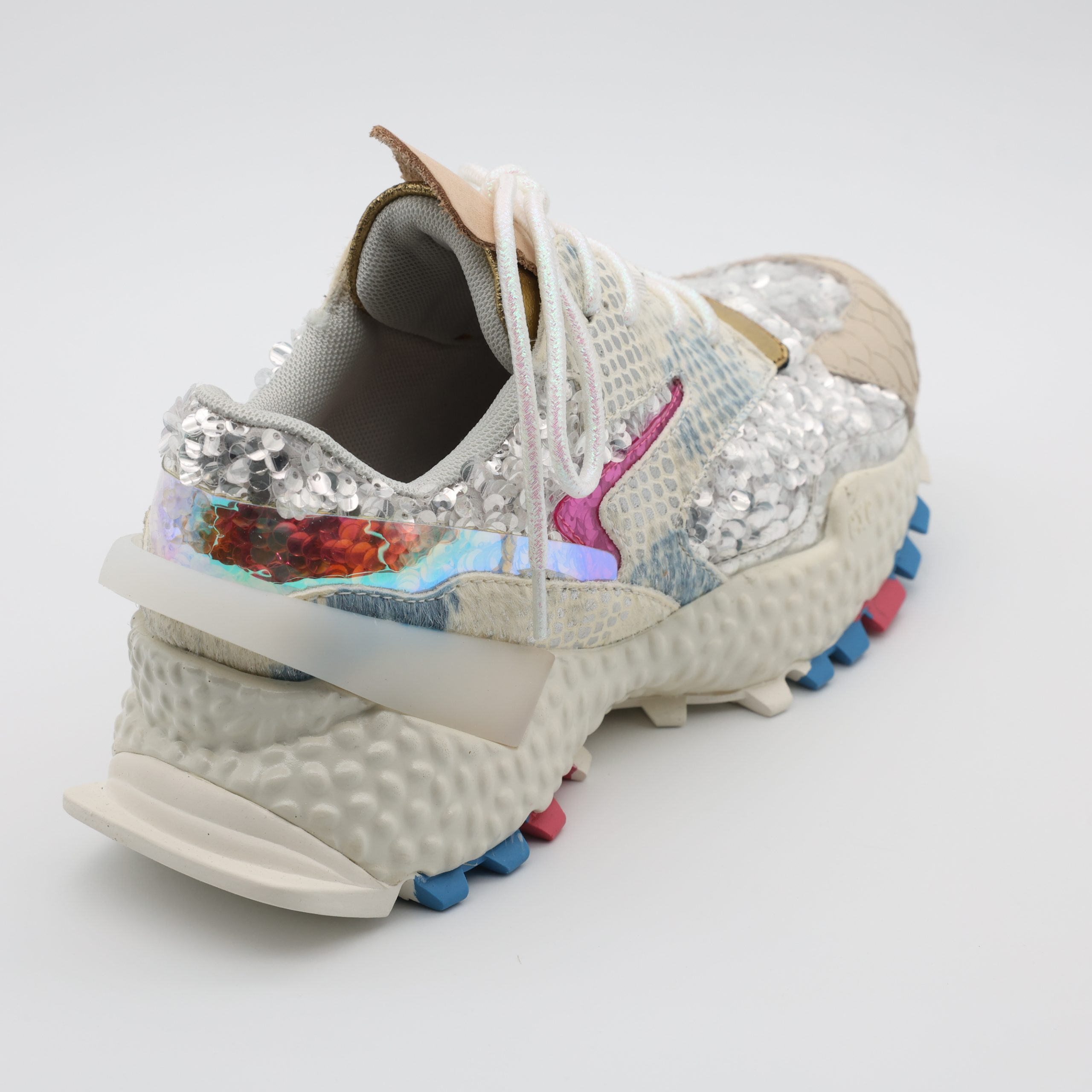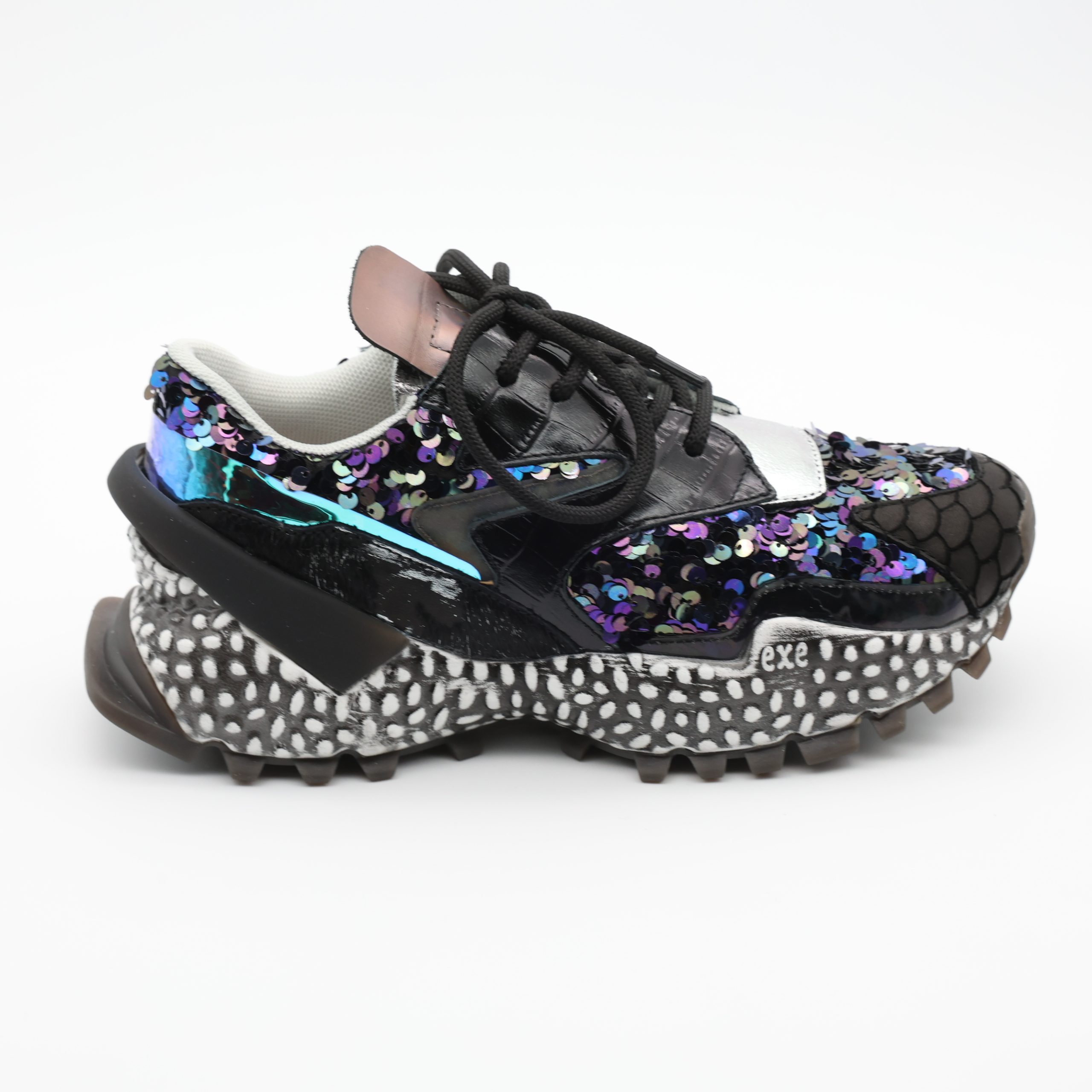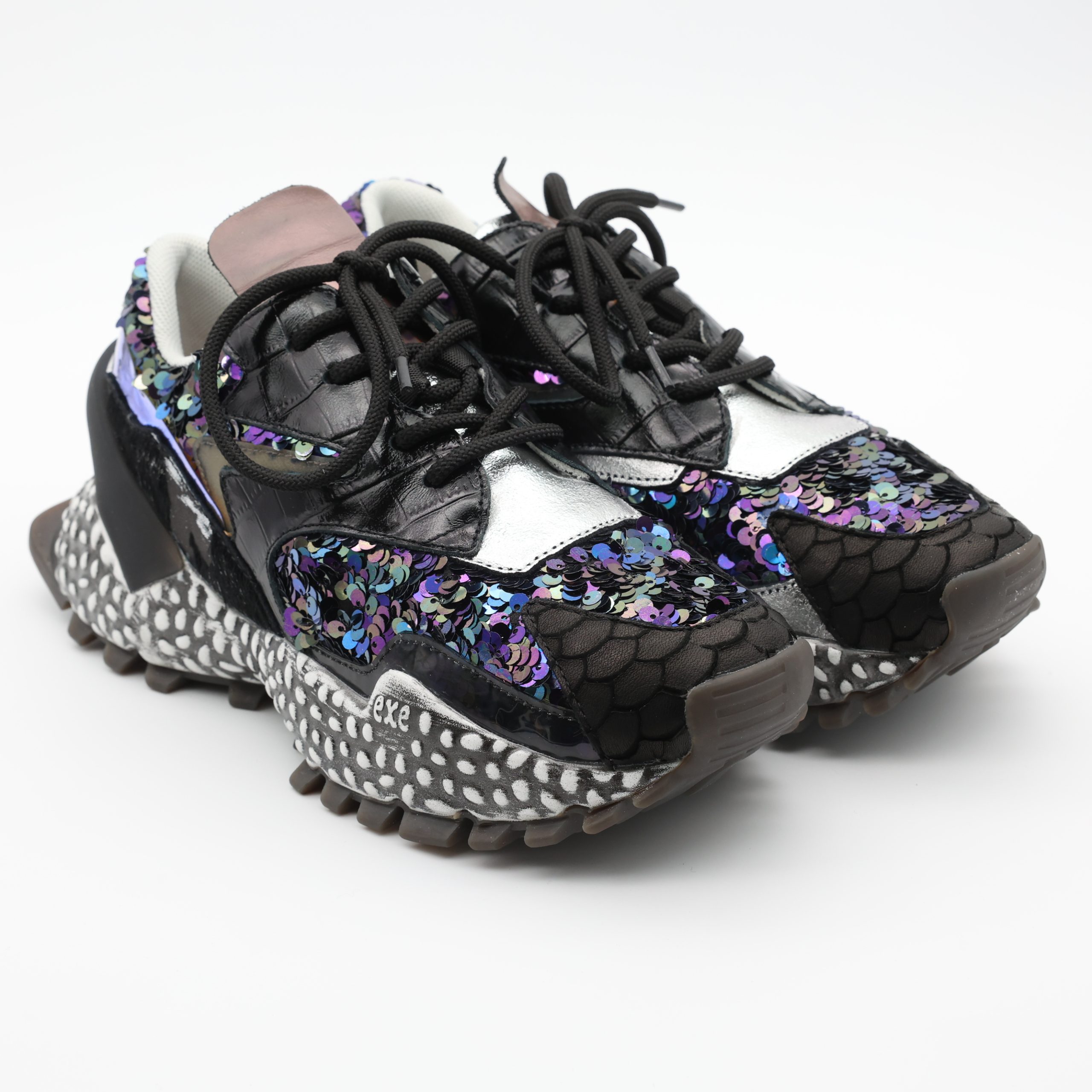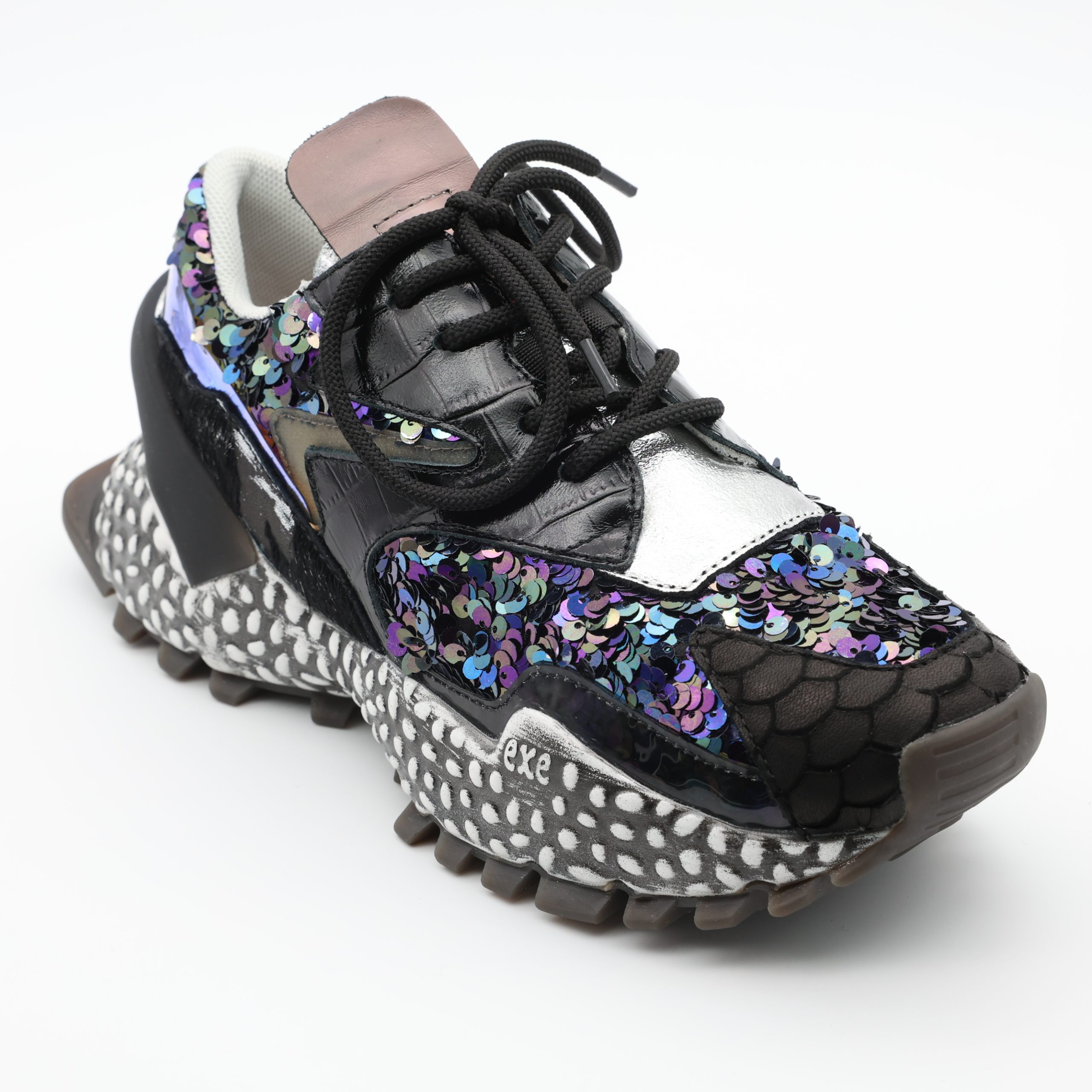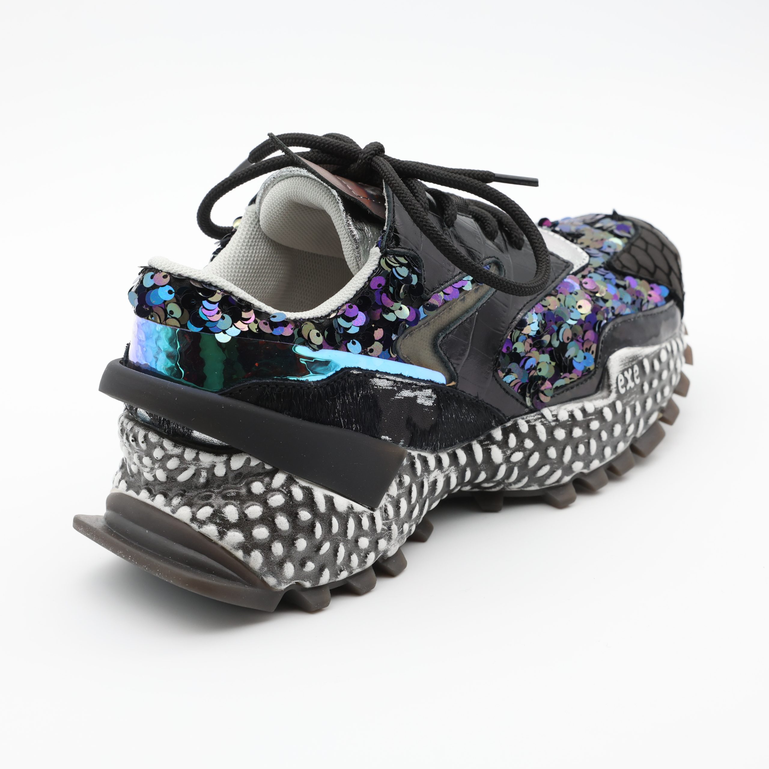O EXÉ 999-14 eleva o look com brilho e personalidade. A mistura de materiais encanta à primeira vista, enquanto o interior em pele e o salto equilibrado proporcionam conforto durante todo o dia. Um ténis que afirma presença sem perder charme.