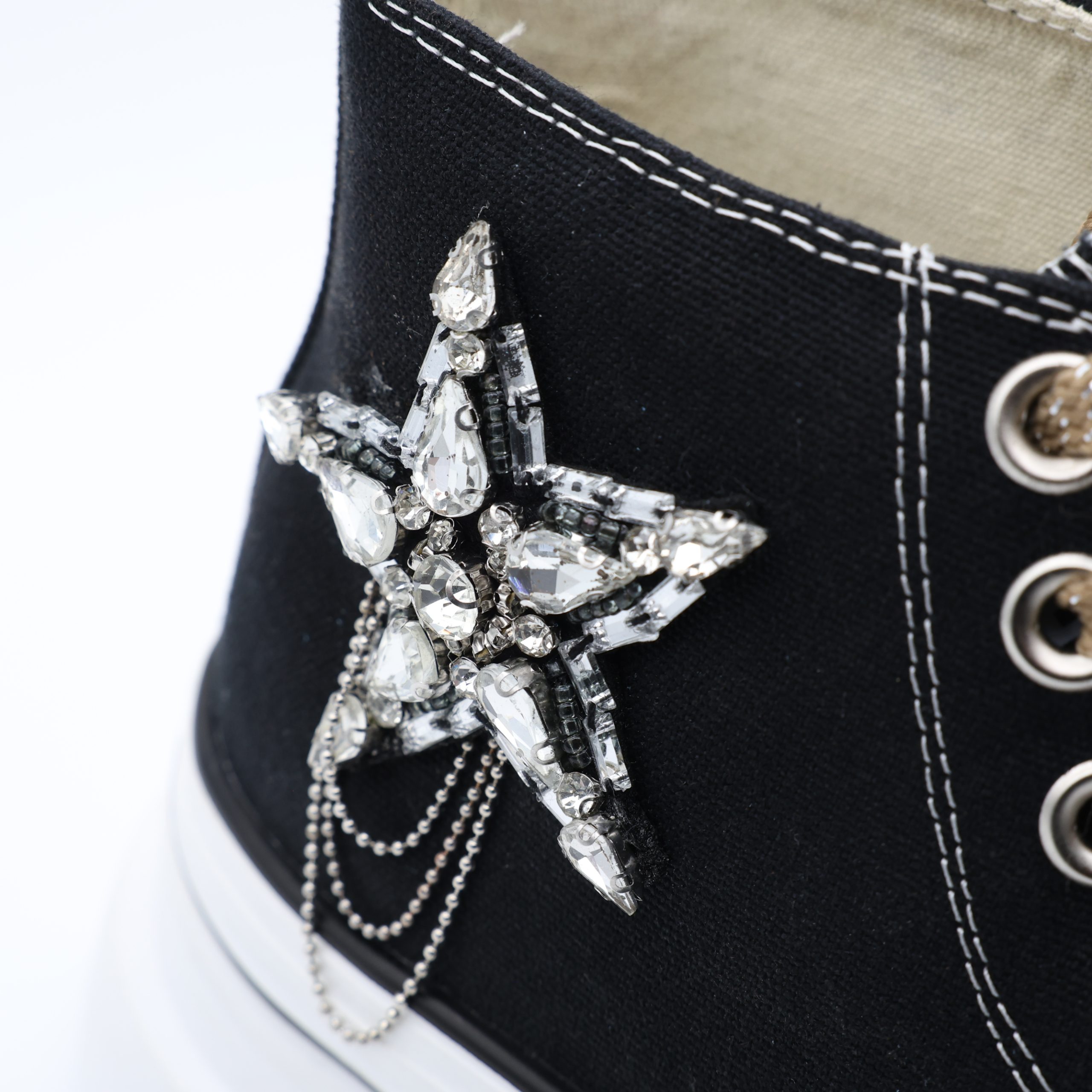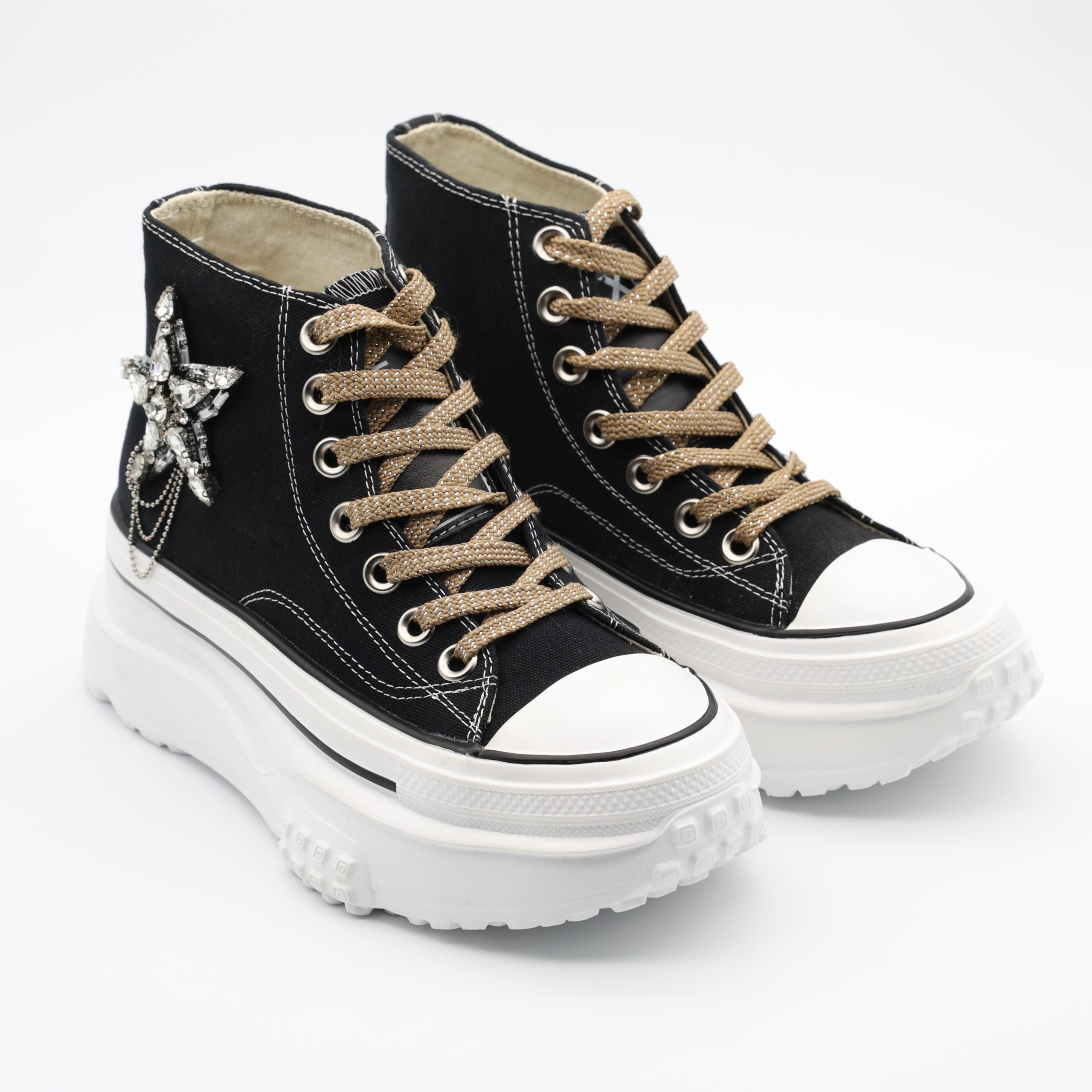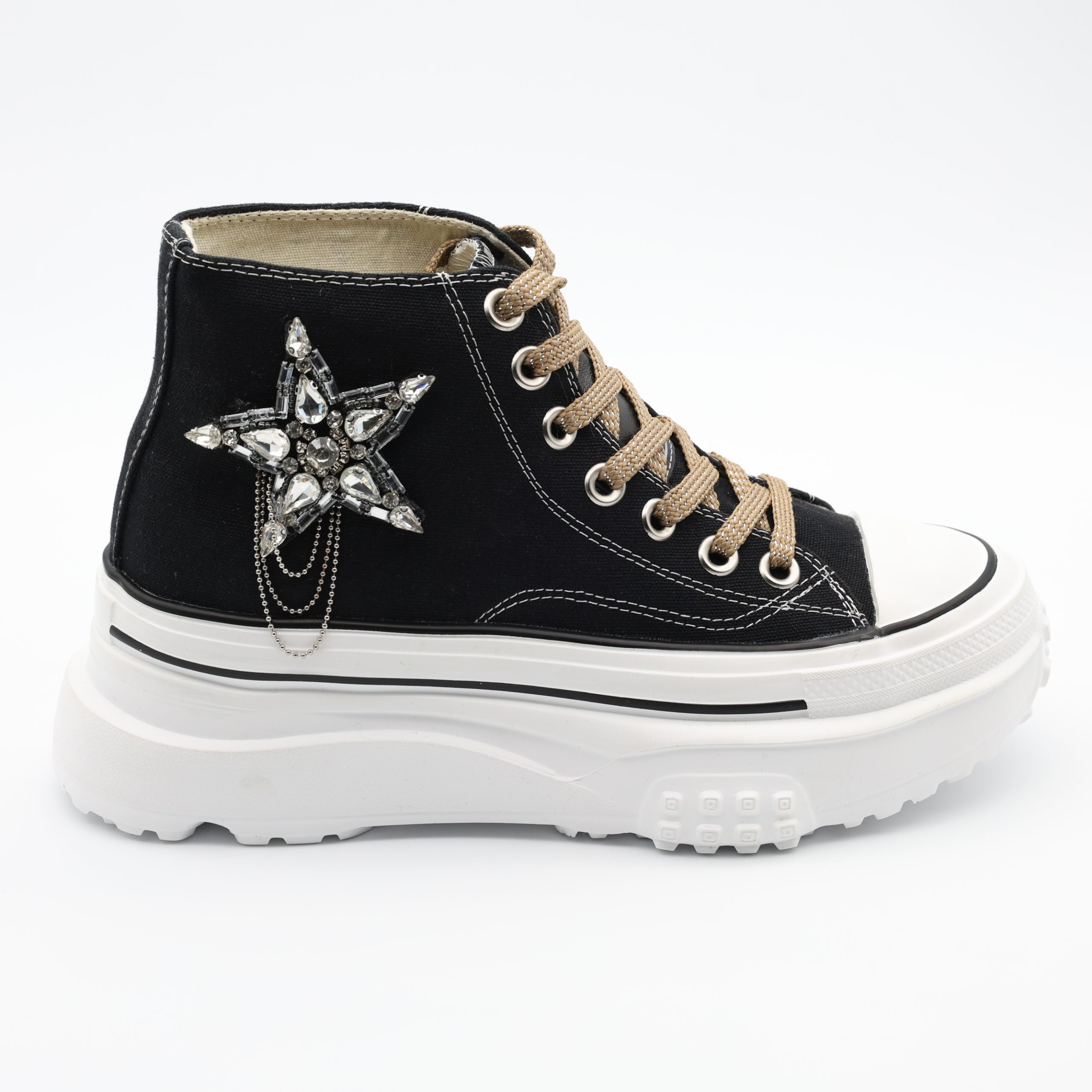 Os Ténis EXÉ SY24-3 combinam estilo arrojado e conforto num design marcante que não passa despercebido. O destaque vai para a aplicação em forma de estrela com cristais e correntes metálicas, que acrescenta um toque glam ao visual urbano.